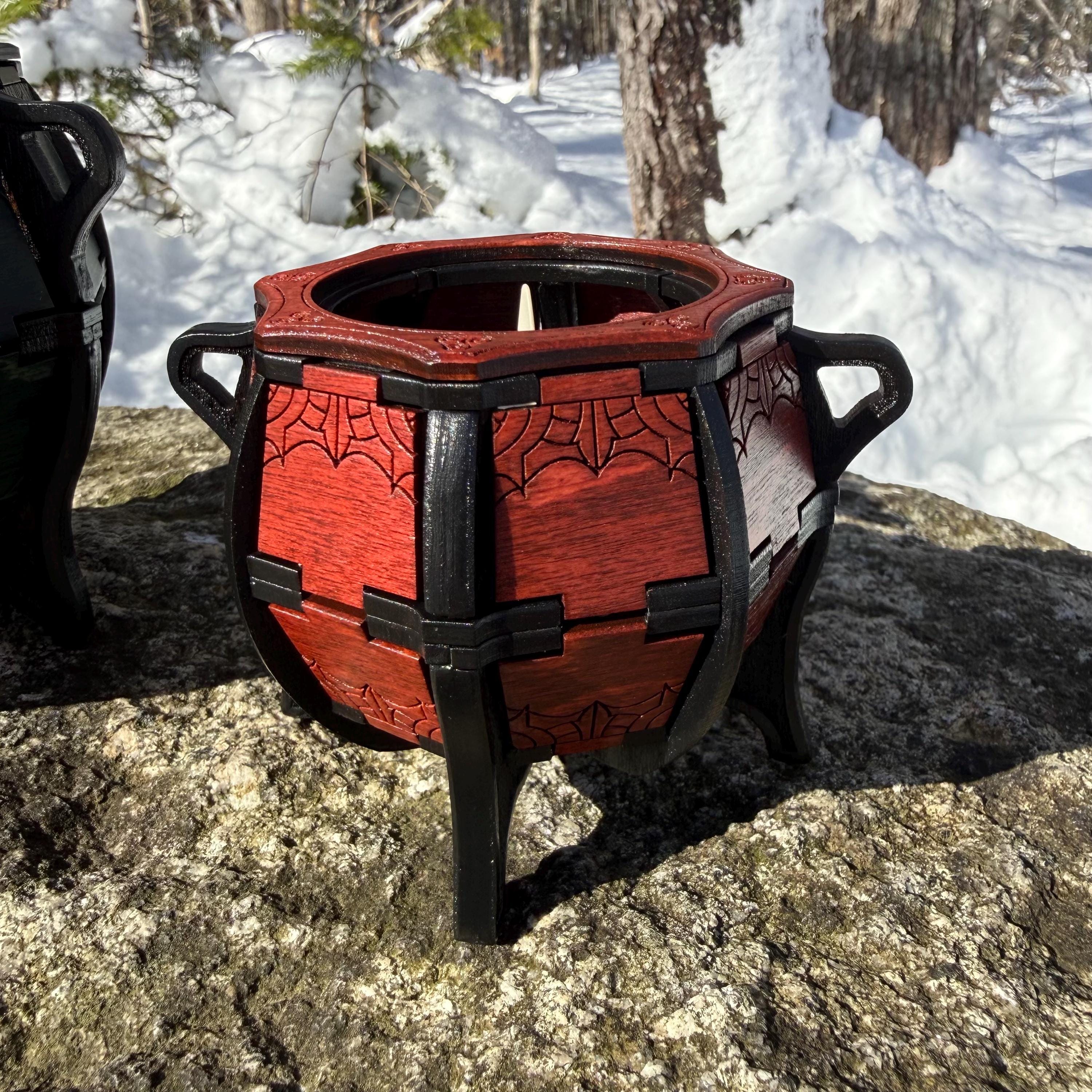 • CUSTOMIZATIONS AVAILABLE: selectable stain color for the cauldron walls and top ring, as well as 2 available sizes. In all creations, the cauldron's framework structure will be stained Black. A stain color chart is included in the Photos; please use the drop-down options selectors to choose your desired look!