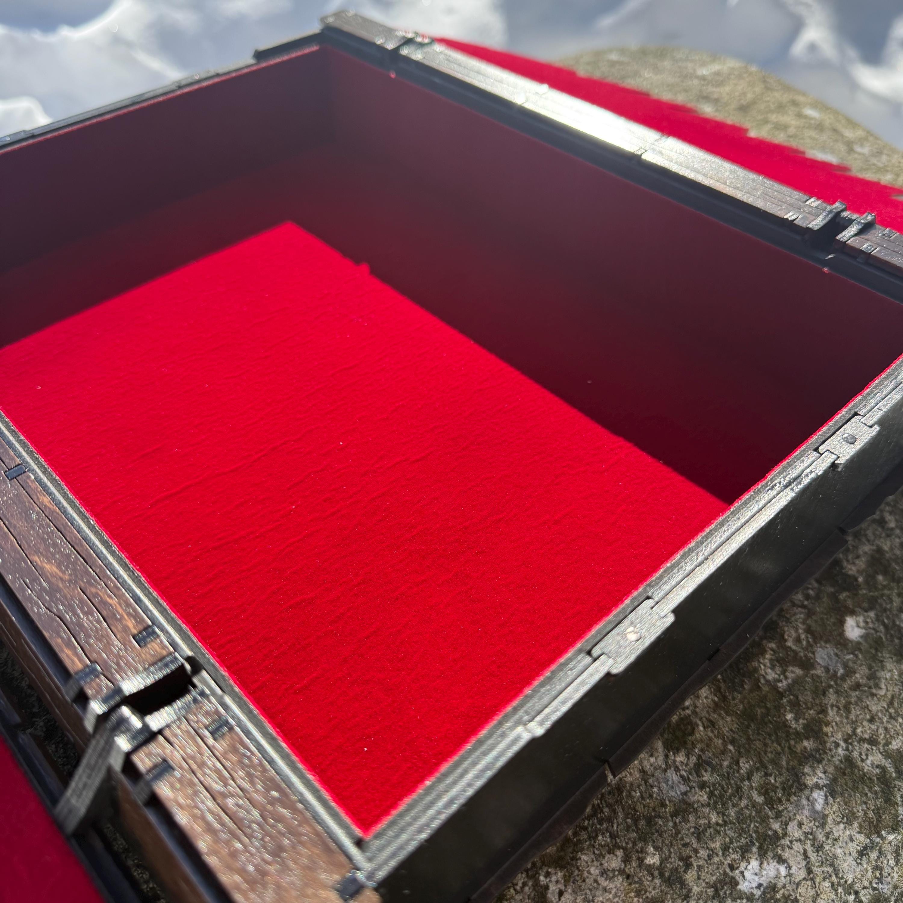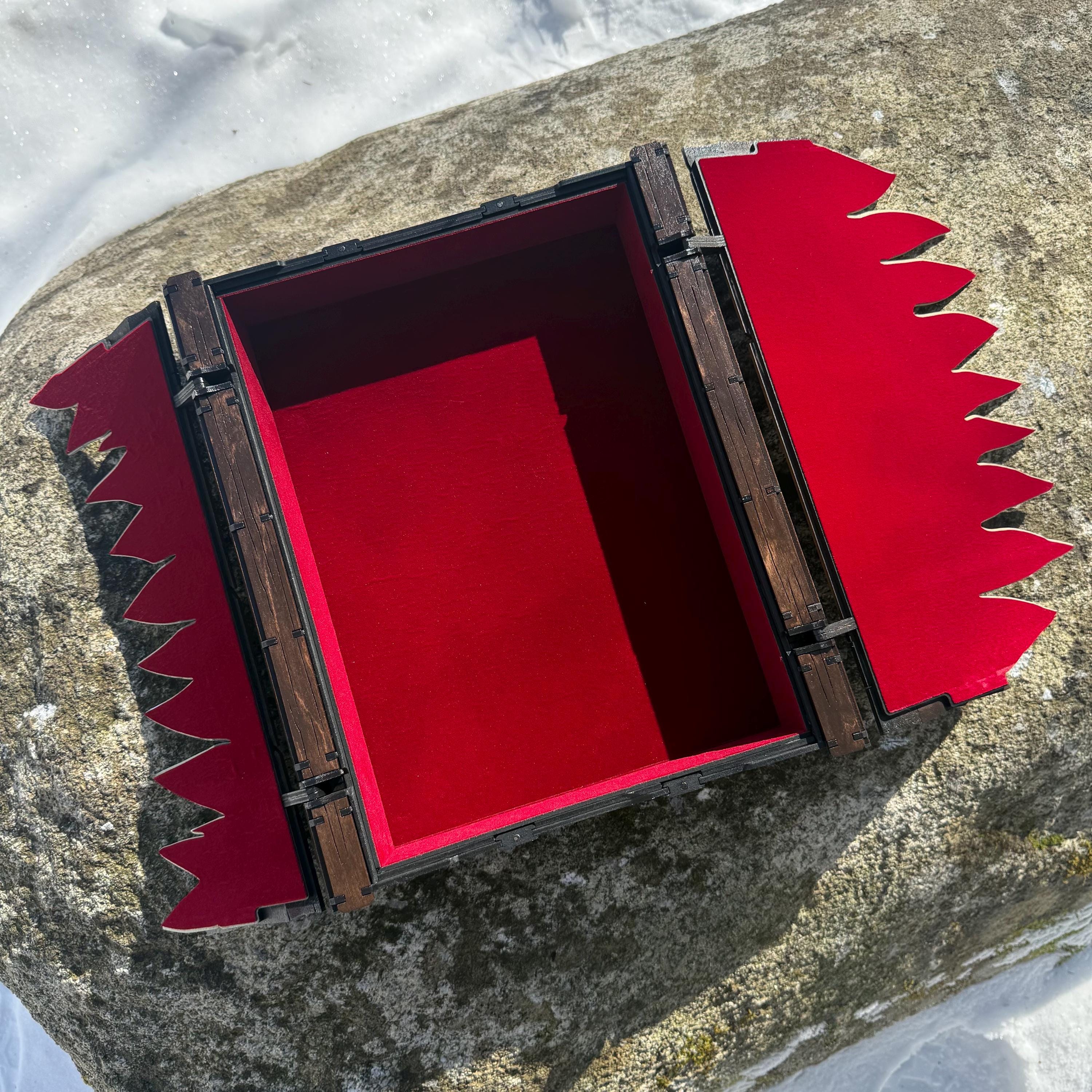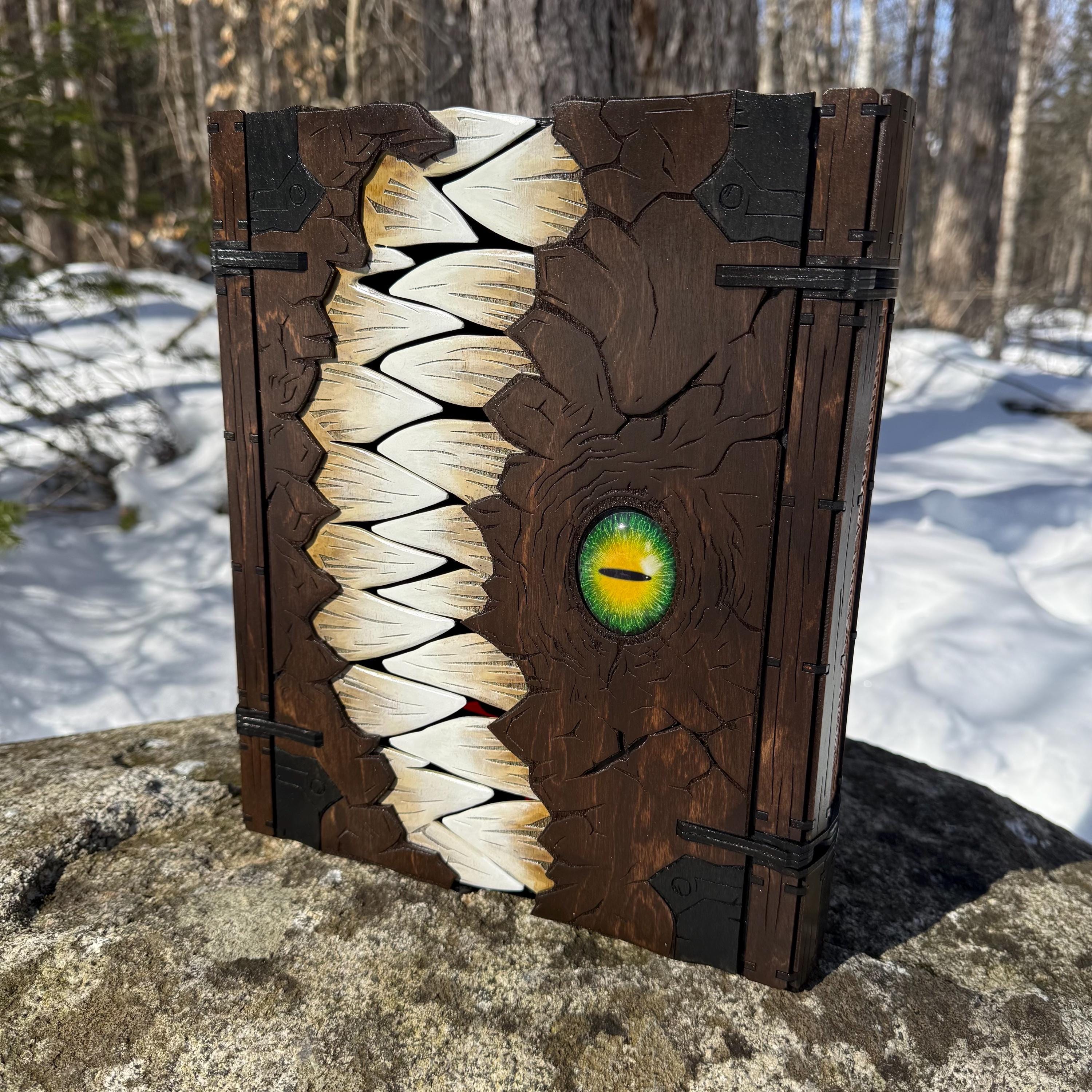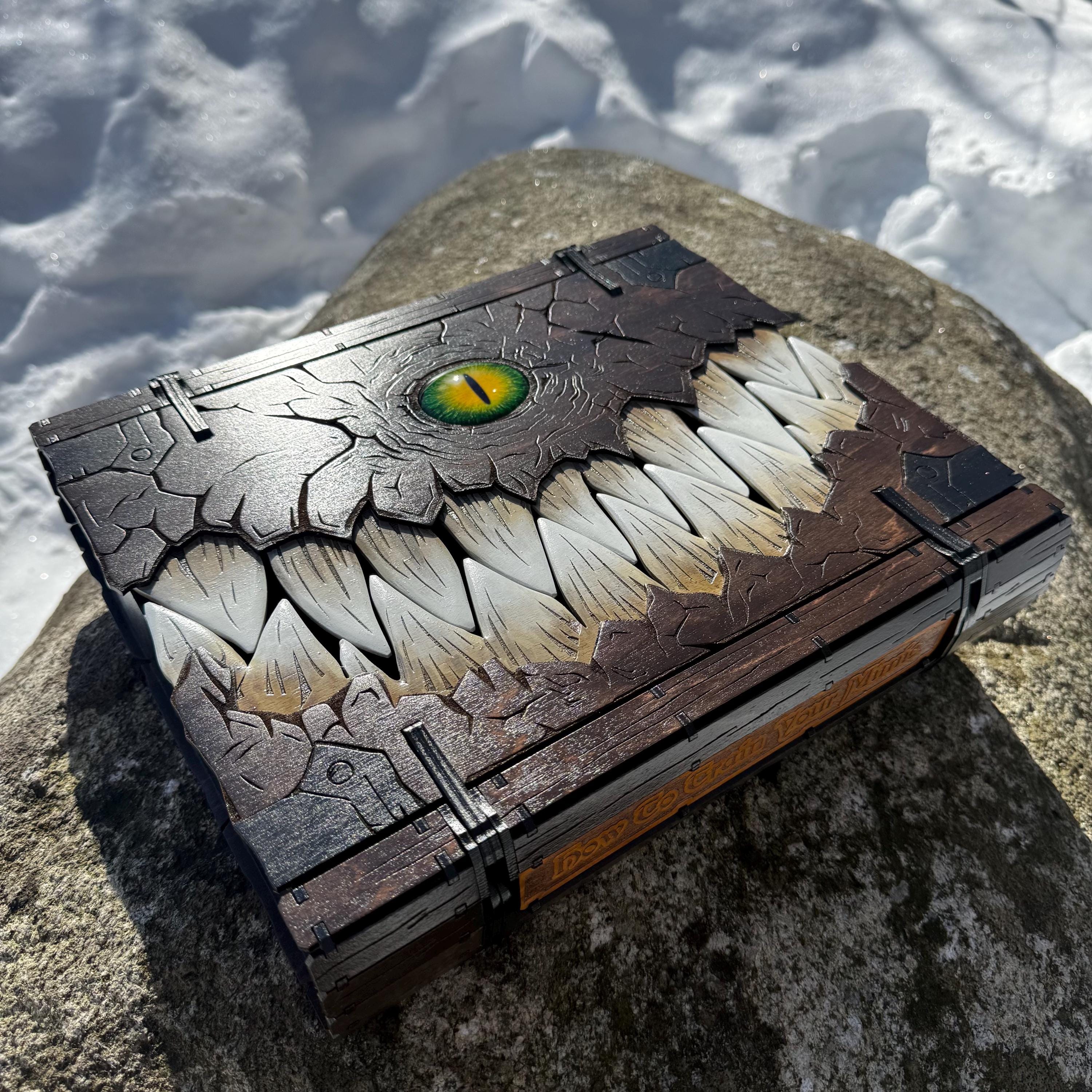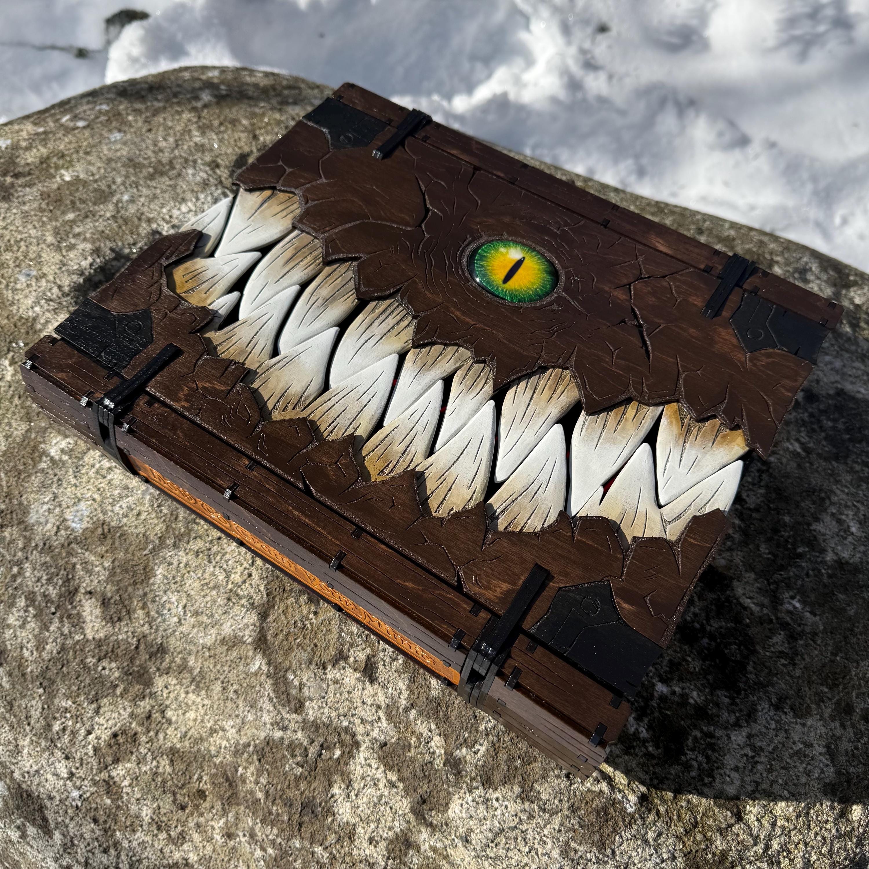 Hailing originally from the private library of a well-known Drow wizard, "Gulper" is an imposing book box mimic, featuring a double-hinged split lid held closed magnetically, and spacious storage fully lined in soft jeweler's velvet. Each Gulper mimic created will be unique, featuring hand-painted details for the immense teeth and a stunning resin cabochon eye for every individual piece! Perfect for players of fantasy RPGs and boardgames, fans of the fantasy genre, collectors of uniquely handcrafted items, or as a gift for that special someone fascinated with dreadfully attractive things!