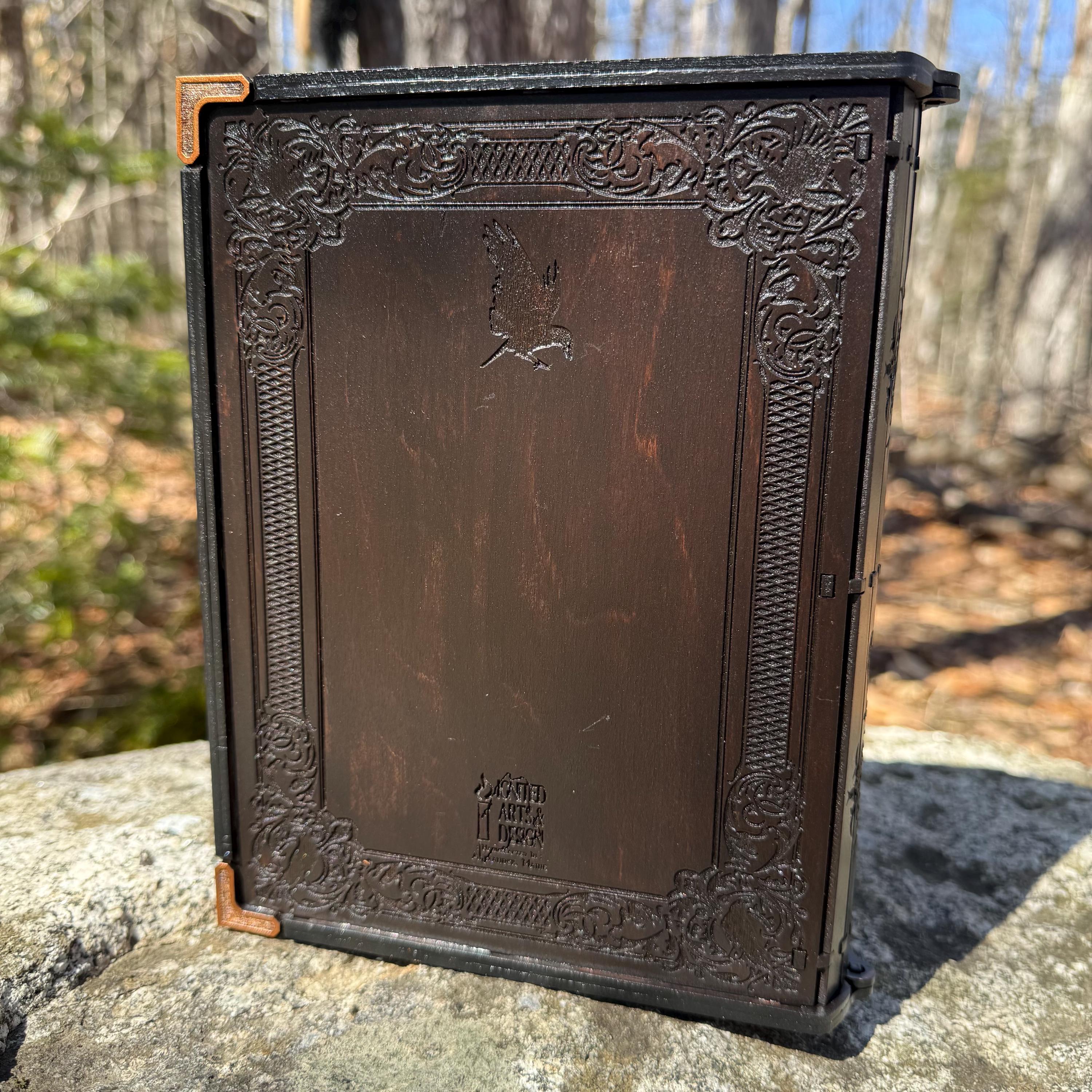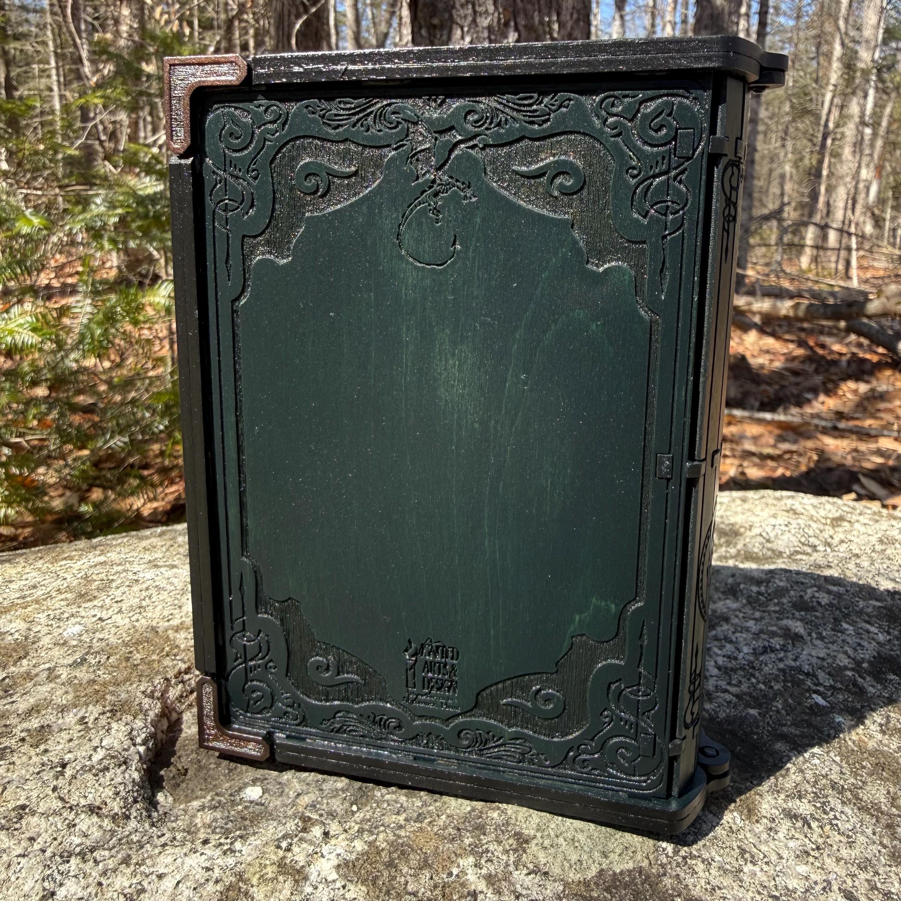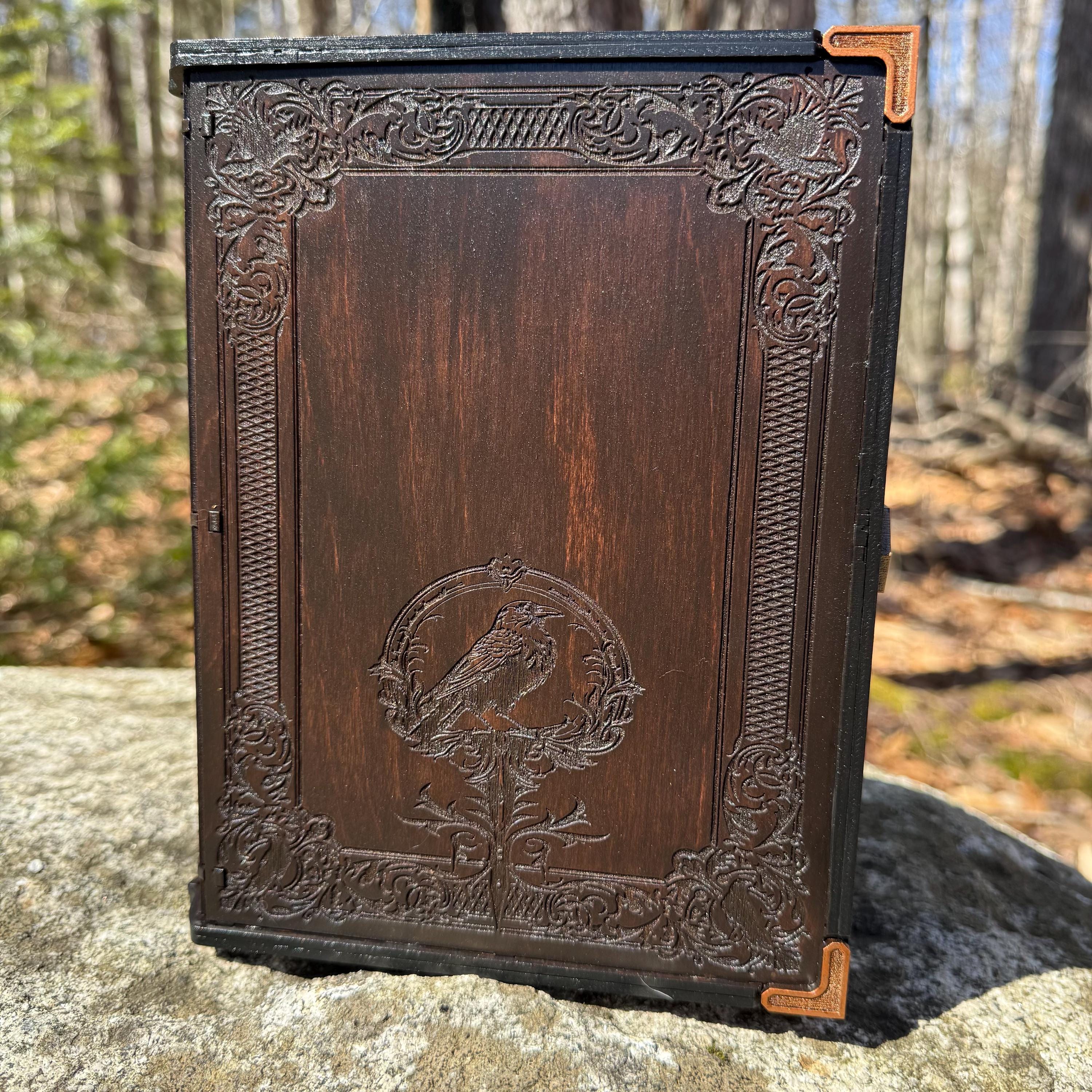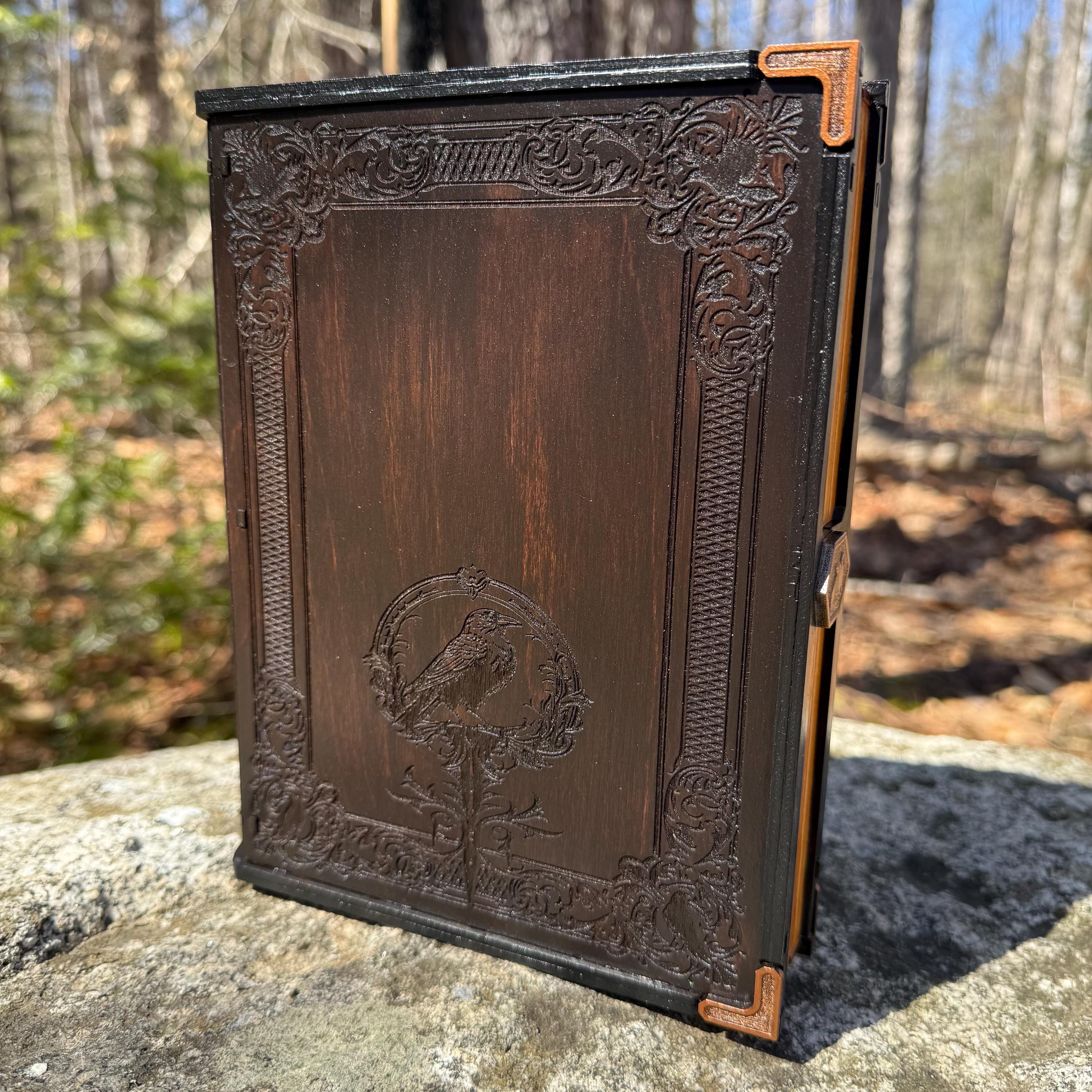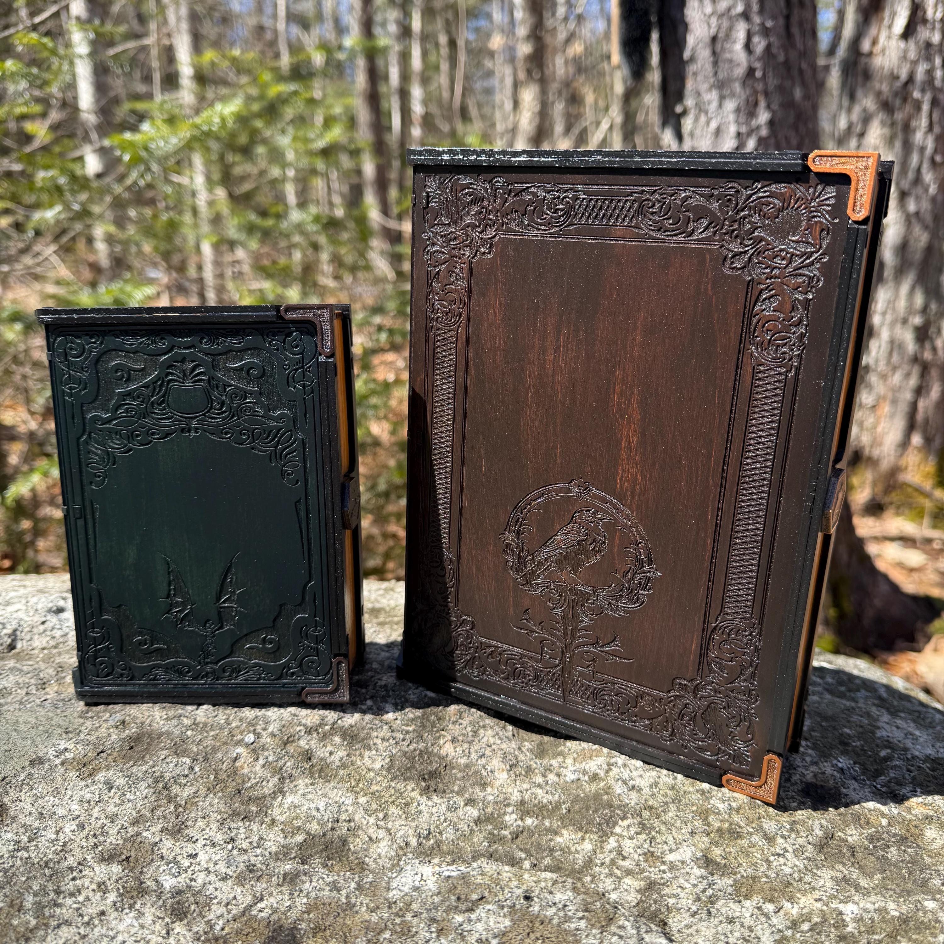 • CUSTOMIZATIONS AVAILABLE: Selectable stain color for the book box binding edge and front/back covers. In all creations, the 3 page edges of the box will be stained and weathered to resemble the pages of an old book. Samples of stain color can be found on the chart supplied in the Photos. Metallic accents for the corners and latch are typically up to the creator, in complement to the stain color selected - but requests for a specific metallic hue are welcomed - please message me!