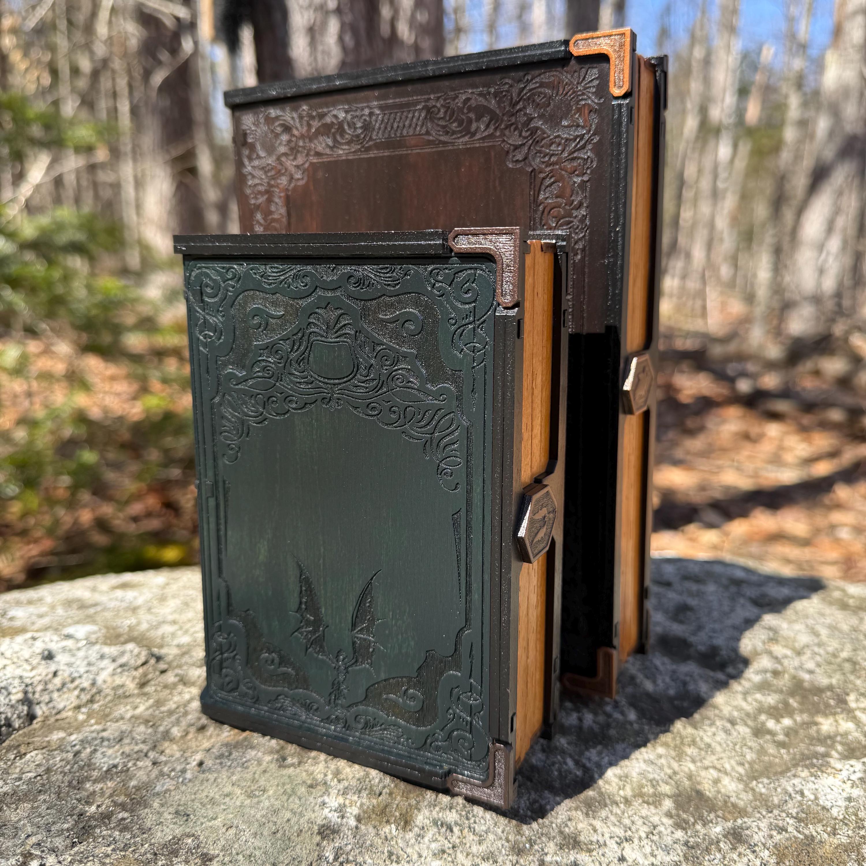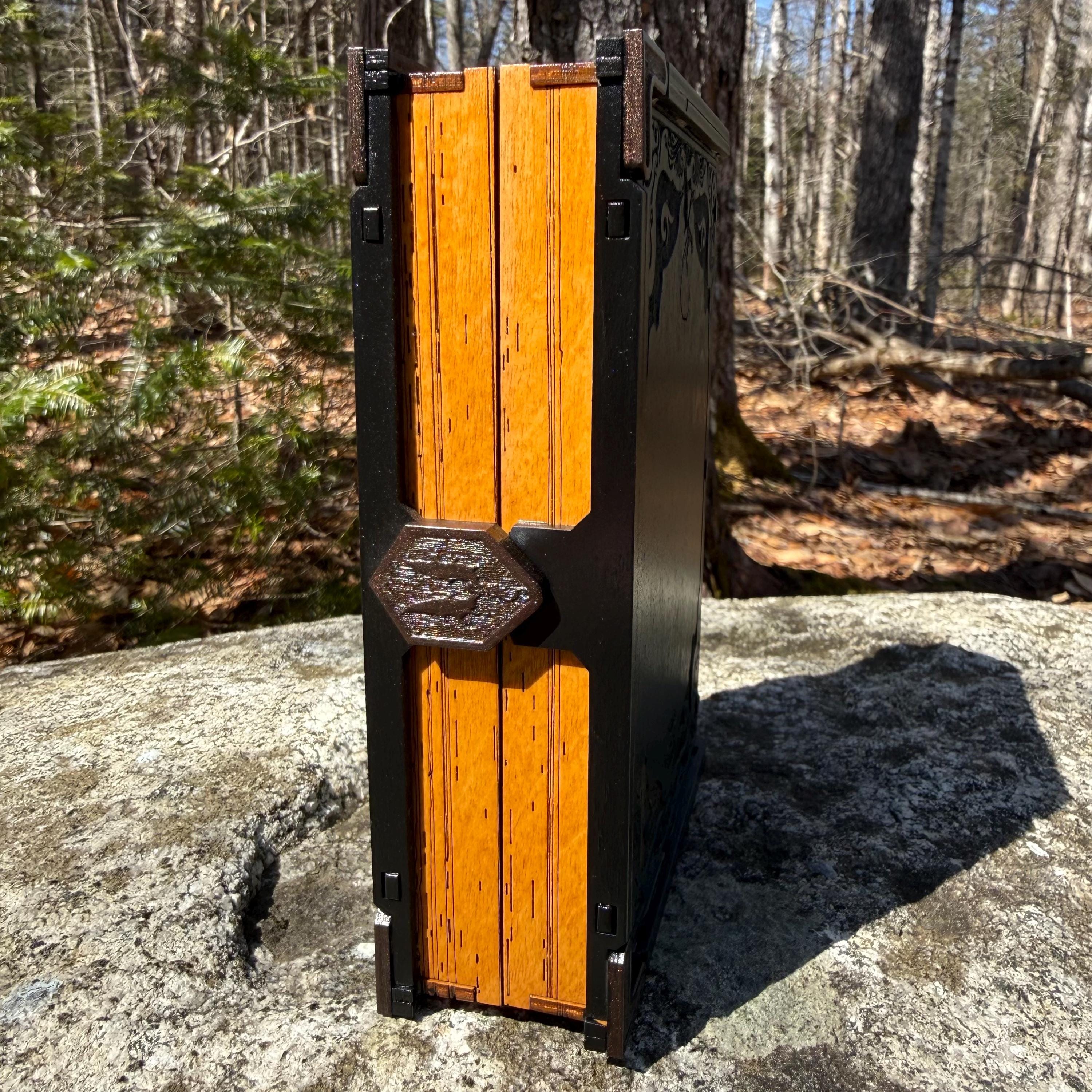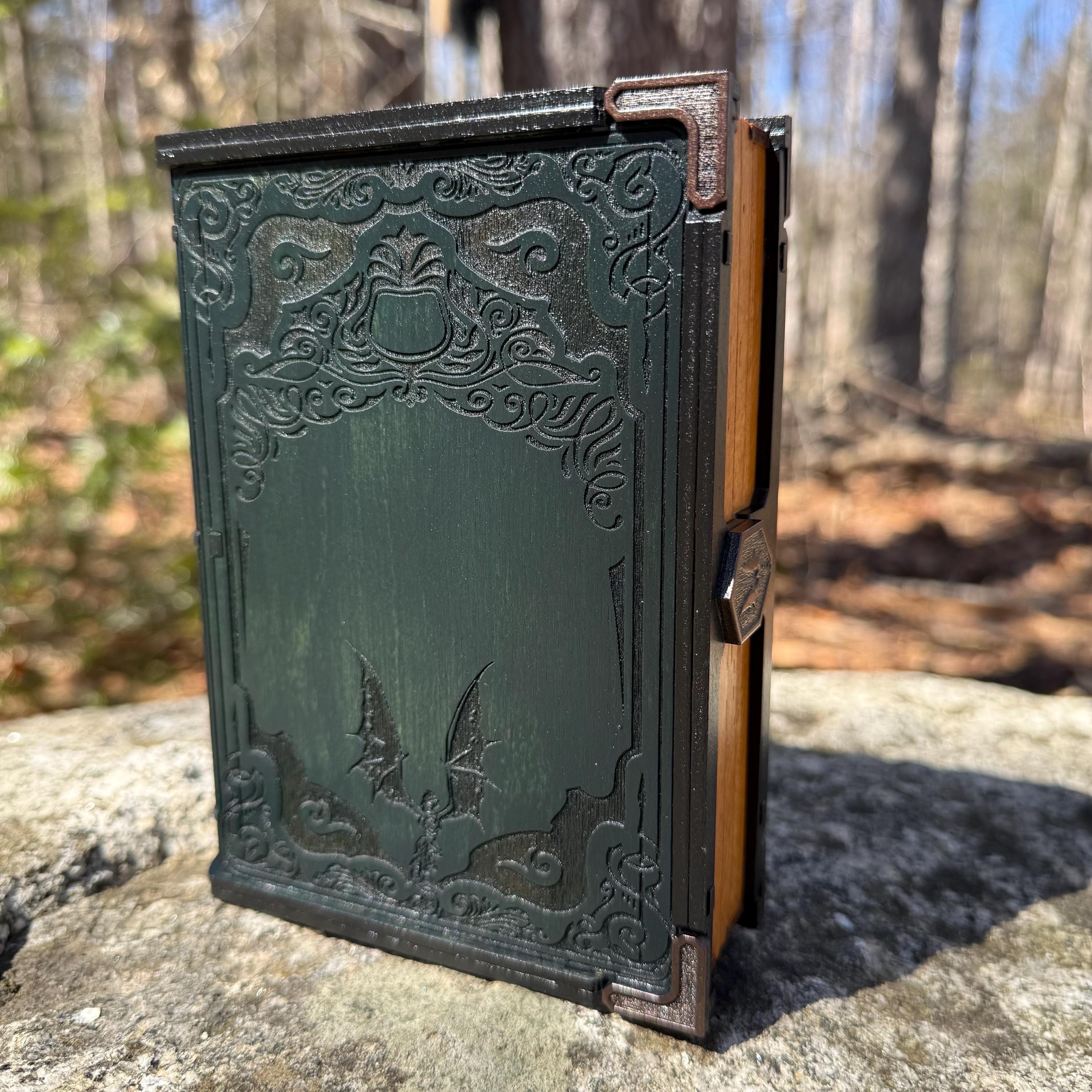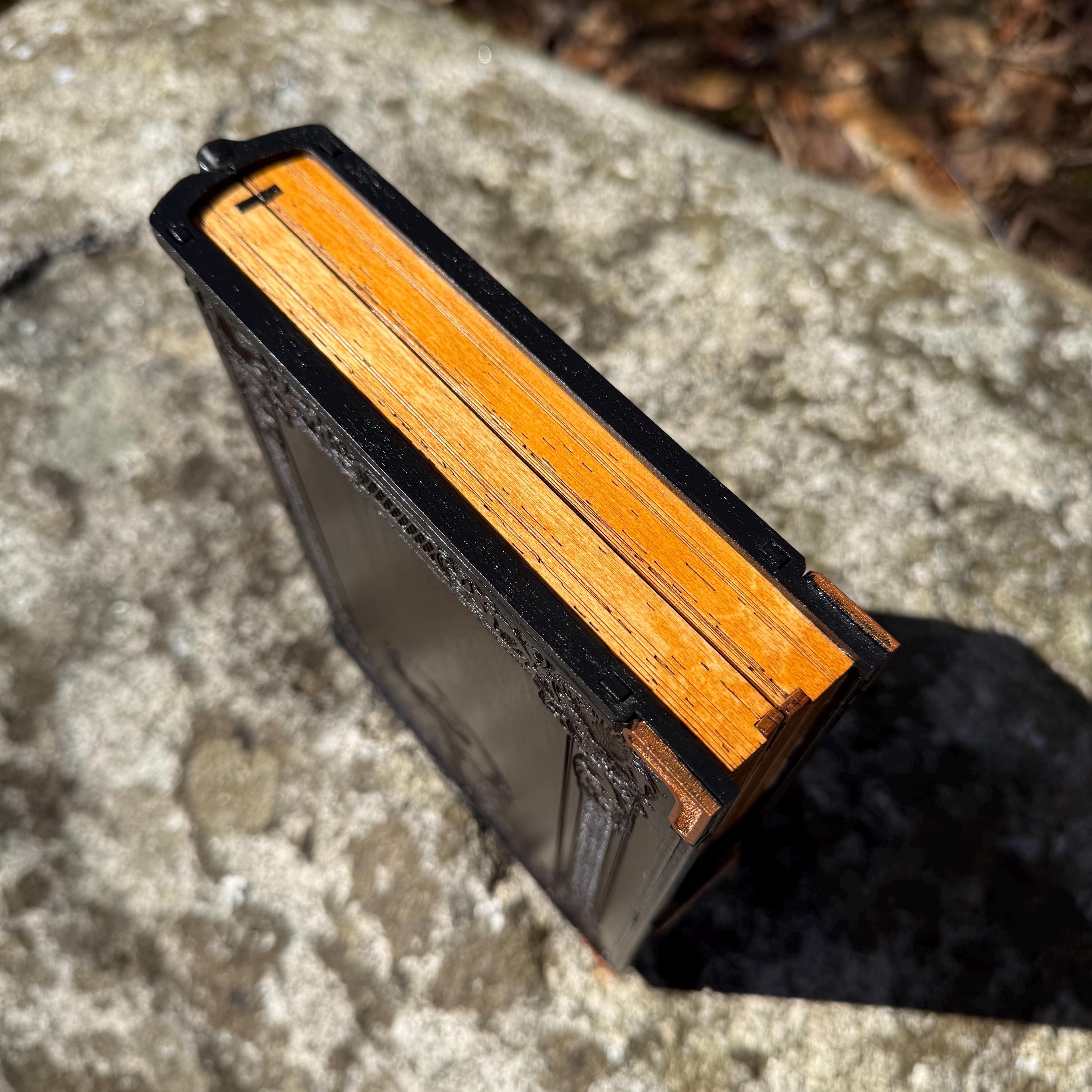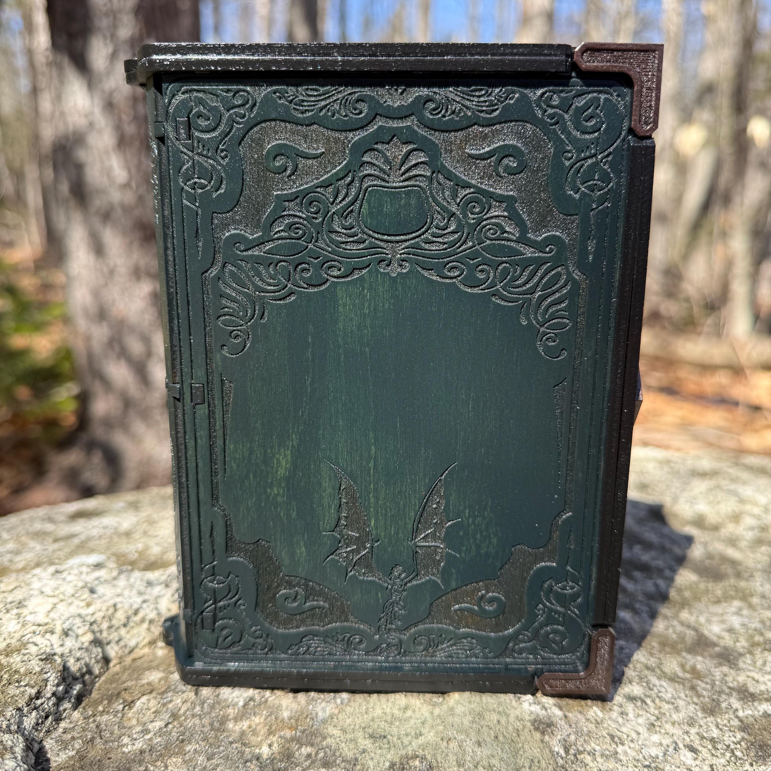 • CUSTOMIZATIONS AVAILABLE: Selectable stain color for the book box binding edge and front/back covers. In all creations, the 3 page edges of the box will be stained and weathered to resemble the pages of an old book. Samples of stain color can be found on the chart supplied in the Photos. Metallic accents for the corners and latch are typically up to the creator, in complement to the stain color selected - but requests for a specific metallic hue are welcomed - please message me!