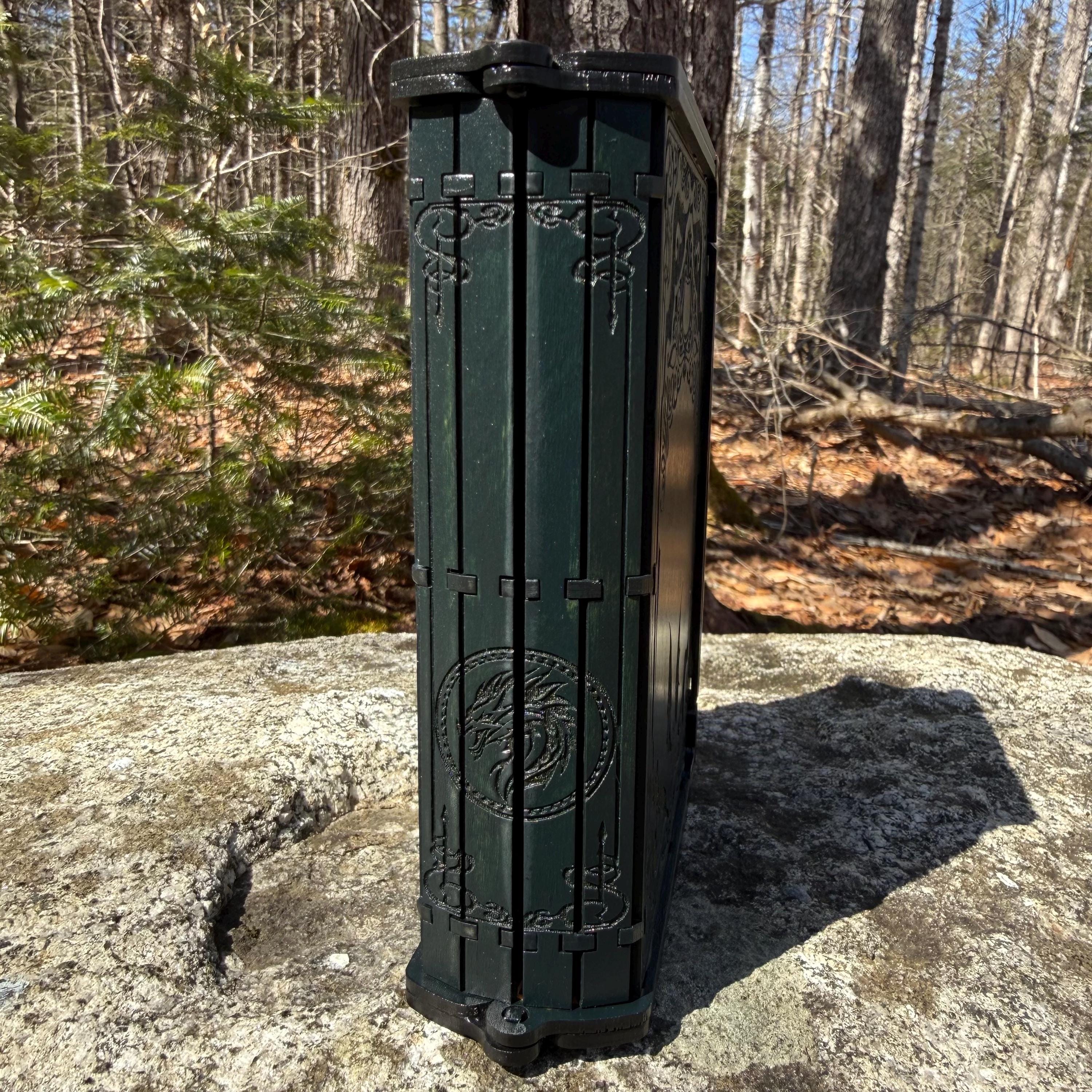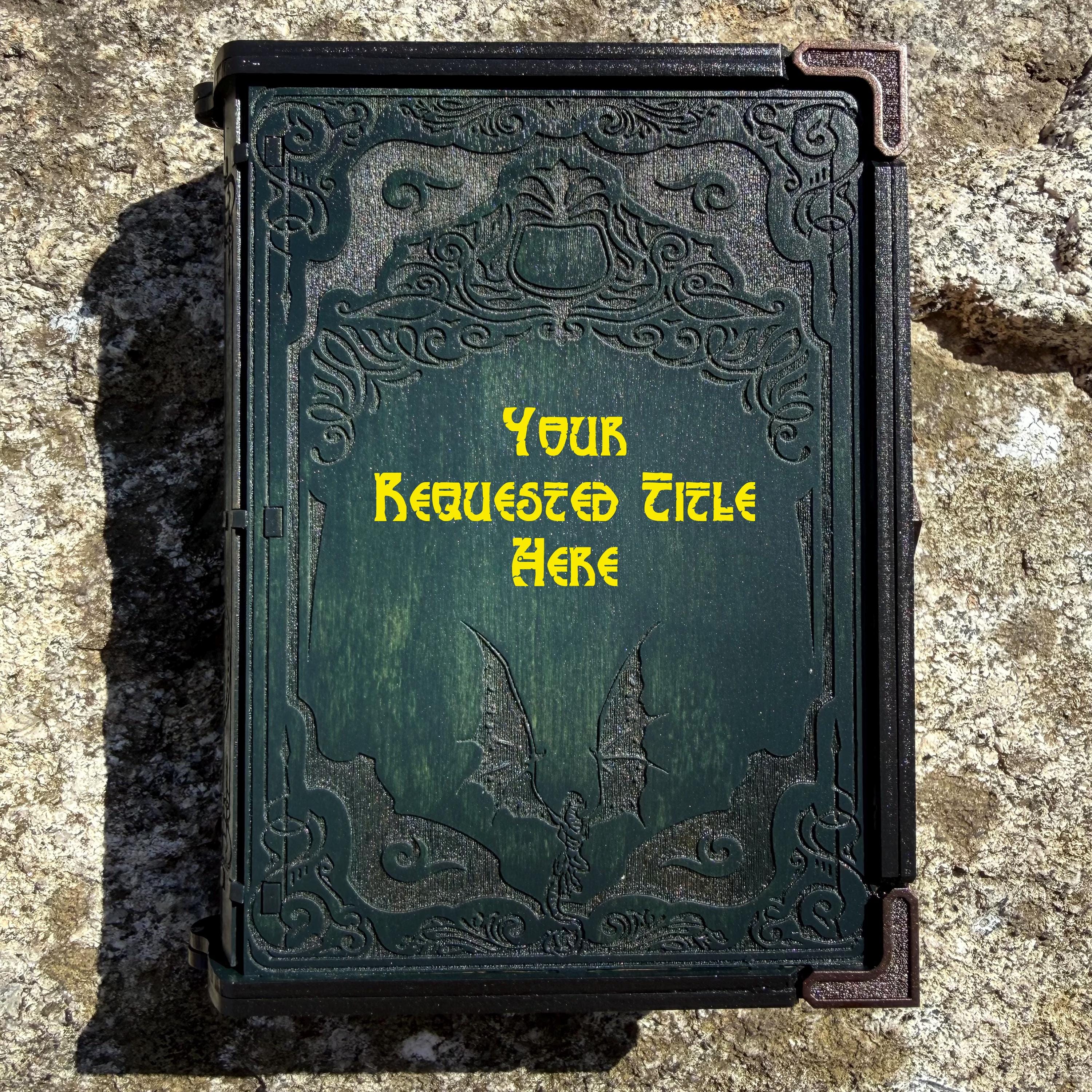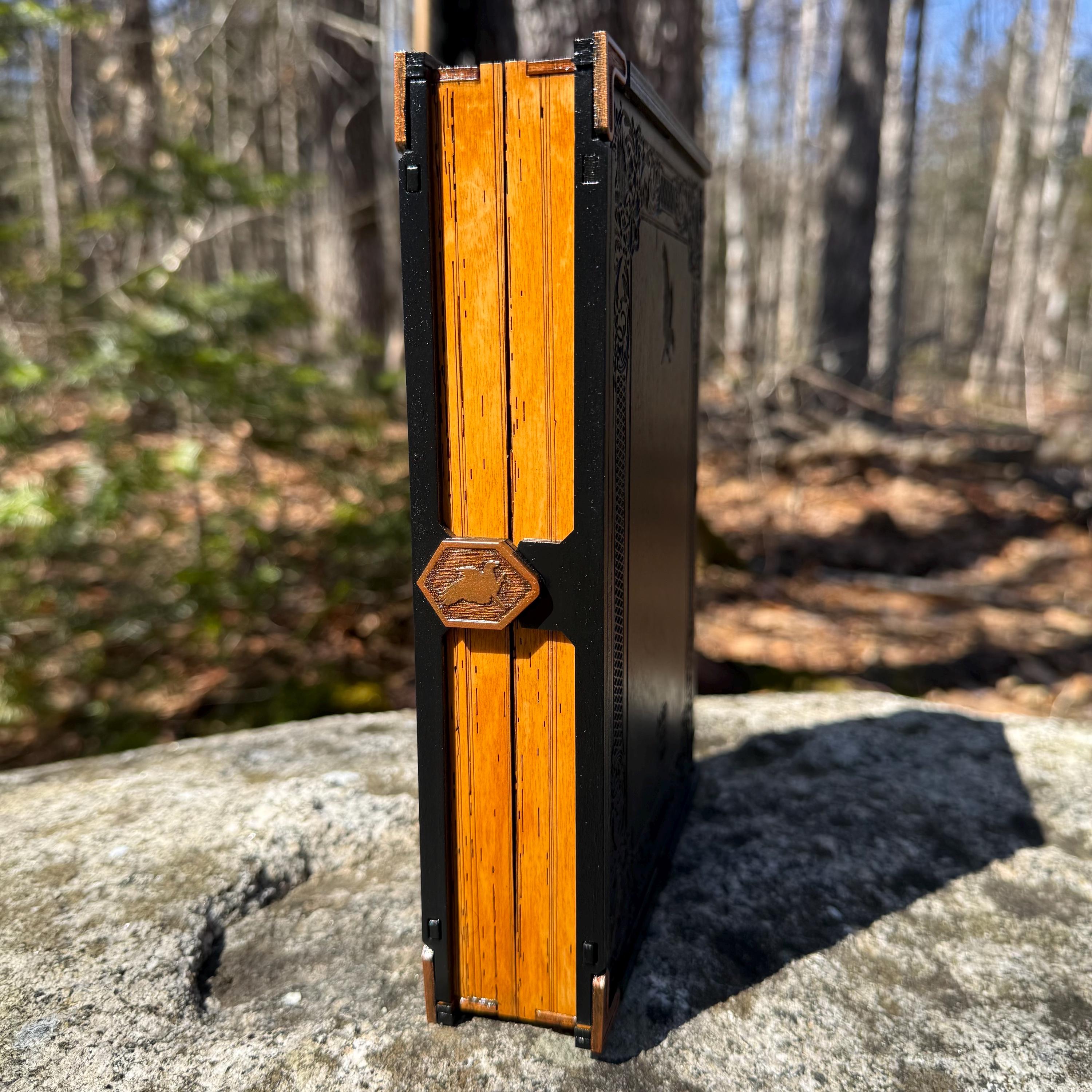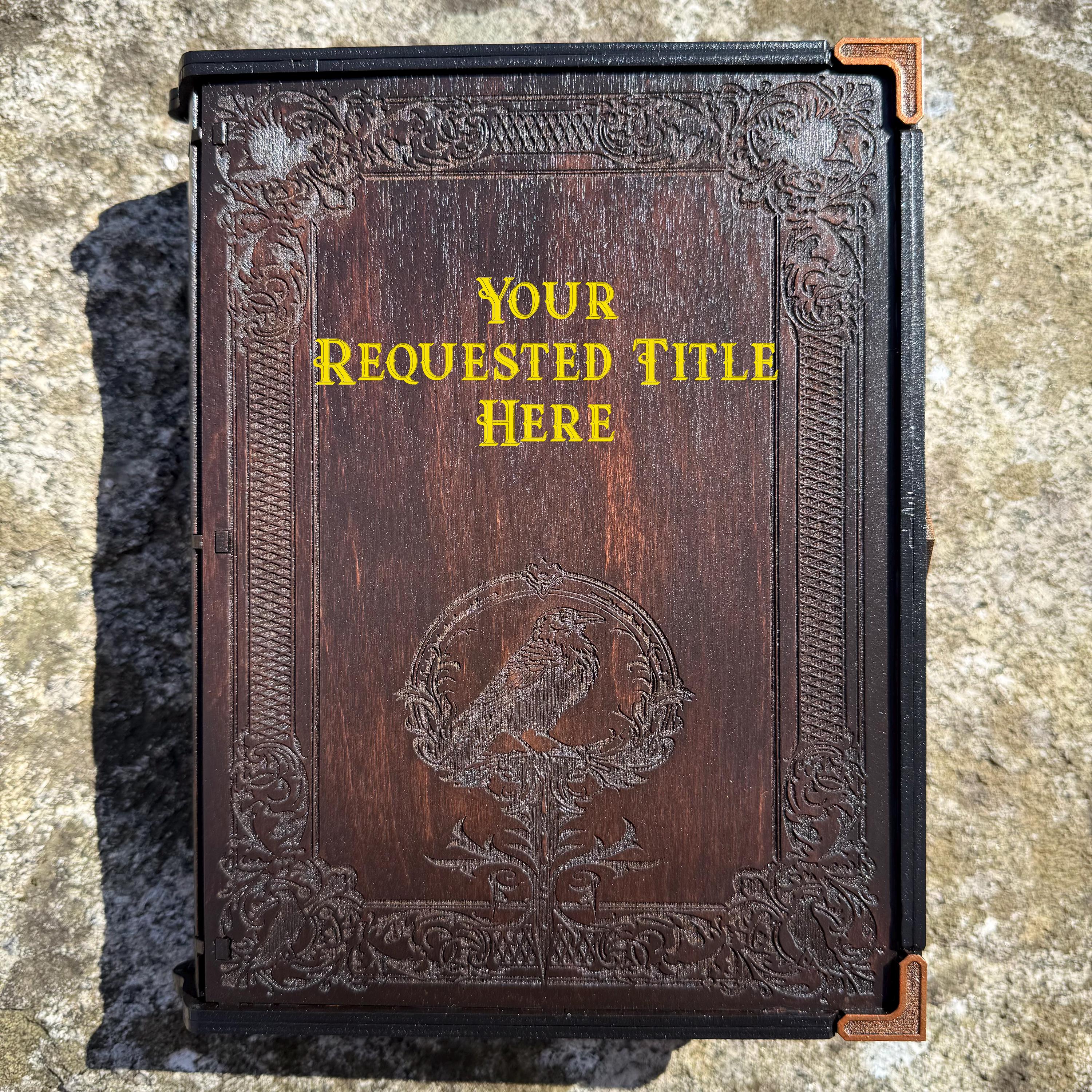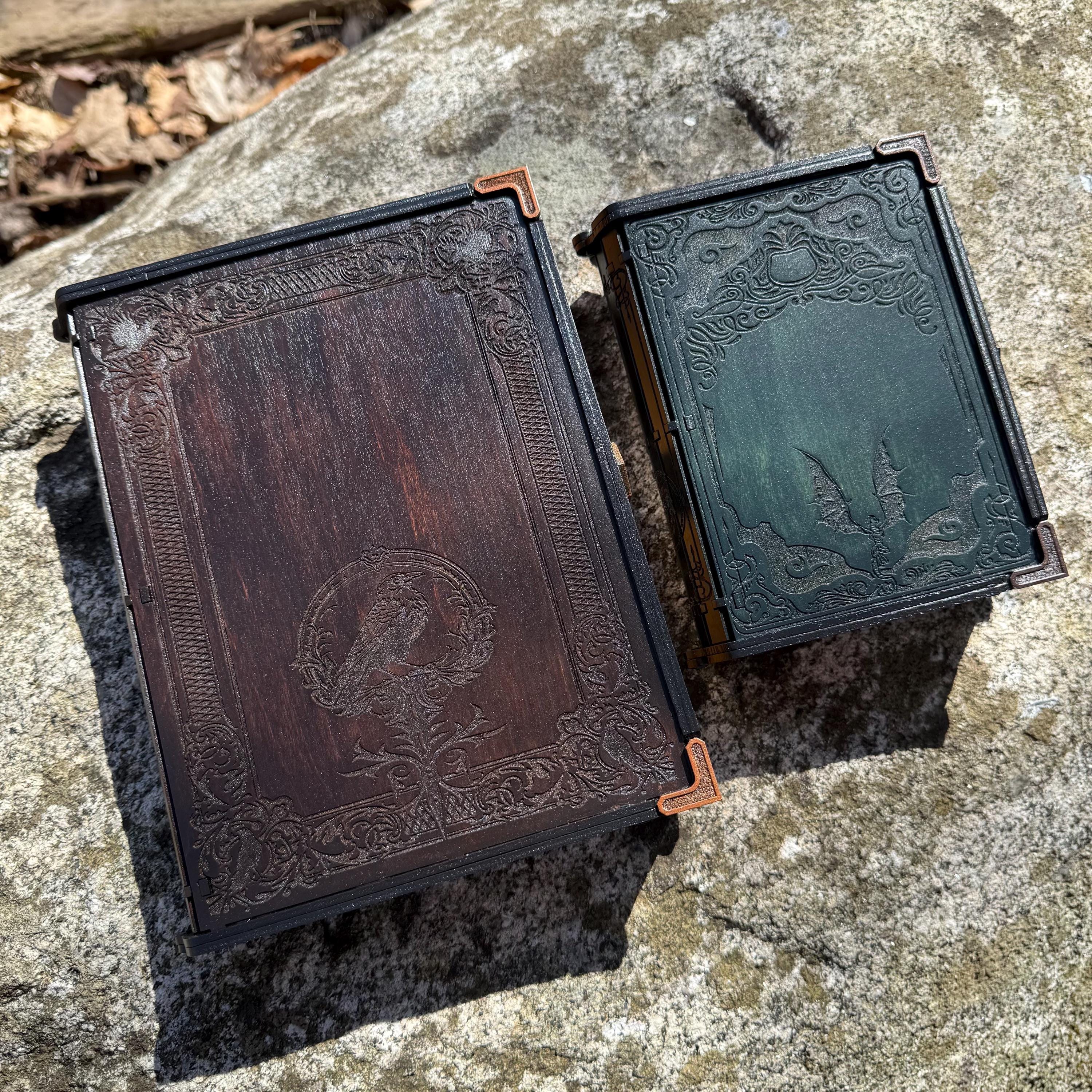 • CUSTOMIZATIONS AVAILABLE: Selectable stain color for the book box binding edge and front/back covers. In all creations, the 3 page edges of the box will be stained and weathered to resemble the pages of an old book. Samples of stain color can be found on the chart supplied in the Photos. Metallic accents for the corners and latch are typically up to the creator, in complement to the stain color selected - but requests for a specific metallic hue are welcomed - please message me!