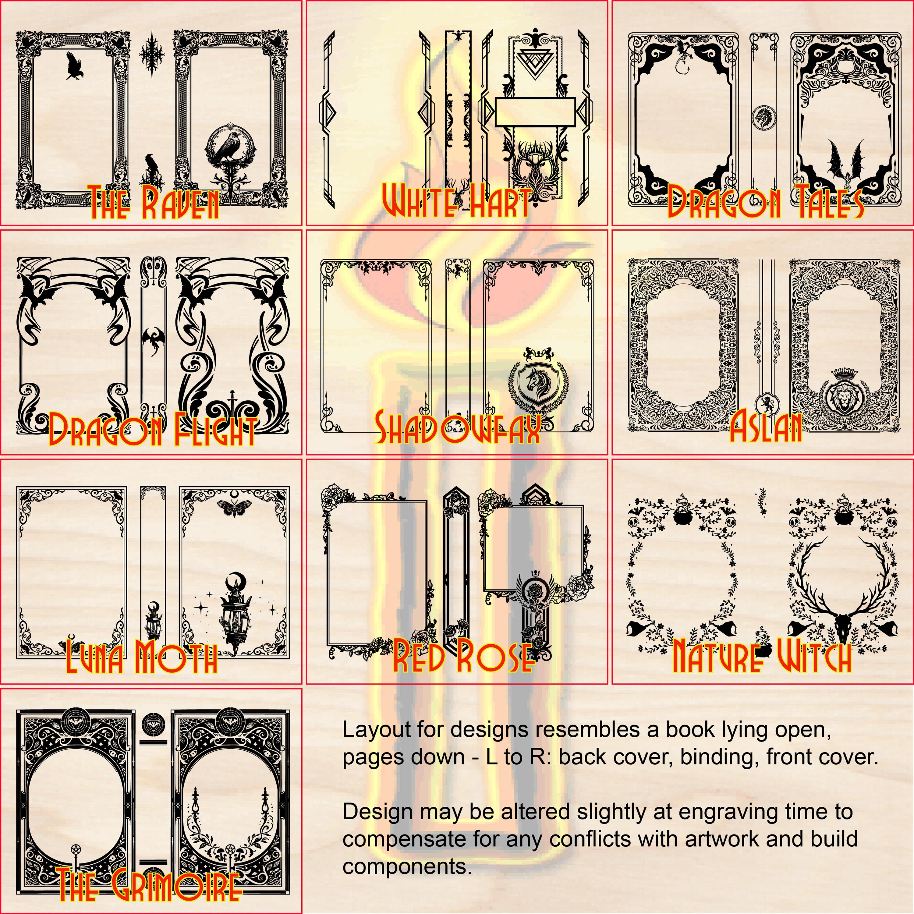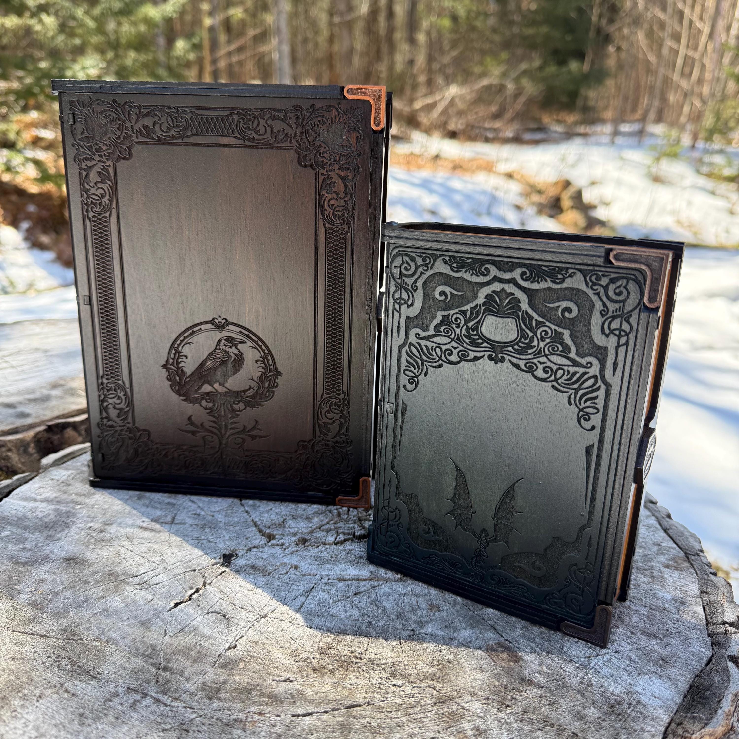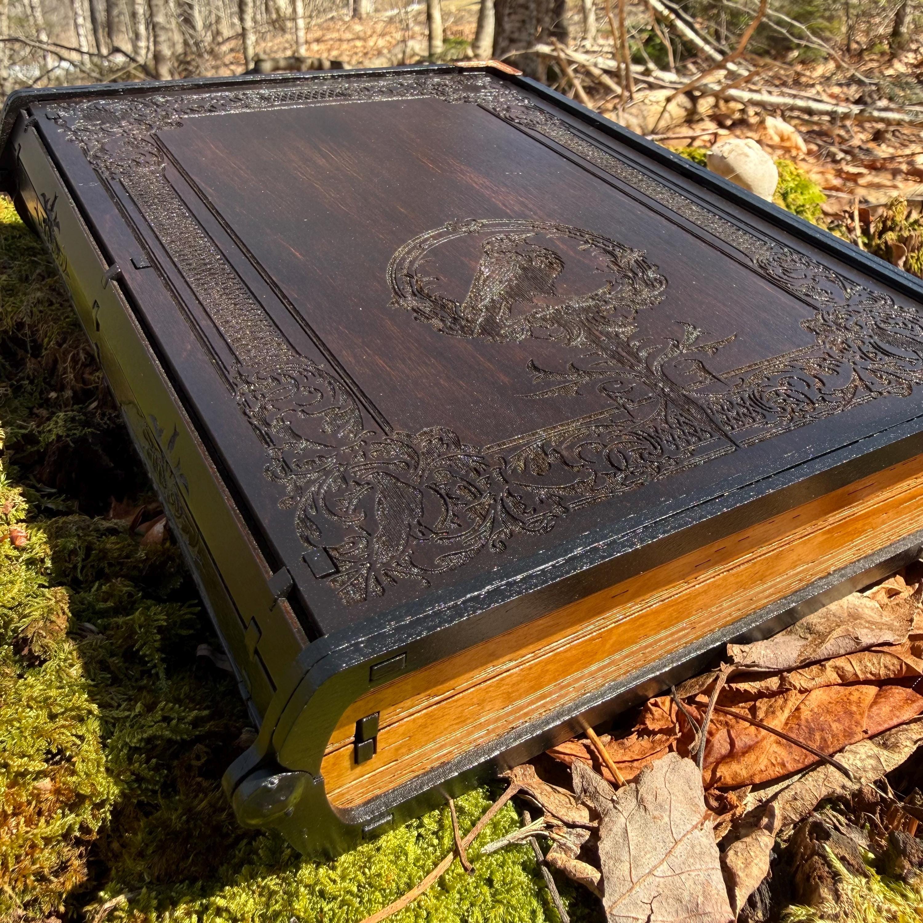 This book box is crafted to resemble a classic old-world hardcover book, featuring highly detailed art nouveau covers and etched 'pages' on three sides. Meticulously handcrafted, this wooden case features laser-engraved visuals on the exterior and an interior lined with jeweler's velvet. This box is very resilient and durable, with double layers that lend greatly to its structural integrity as well as overall appearance. The top is hinged with a concealed wooden hinge system, and magnets keep the lid securely closed. Choose a design for the covers from the selection chart included in the Photos, and request a book title of your own! Available in two sizes, A5 and A6 (see 'MEASUREMENTS', below). This beautifully crafted box makes a wonderful, thoughtful gift for bookworms and literary enthusiasts, and complements any book collection!