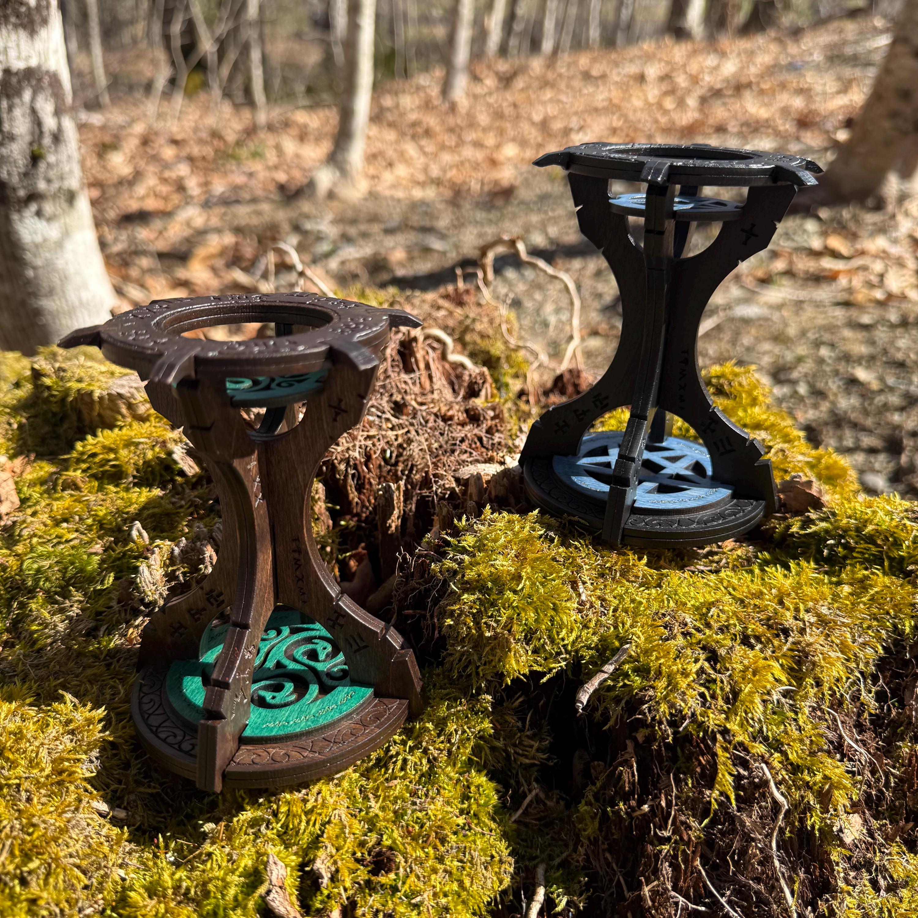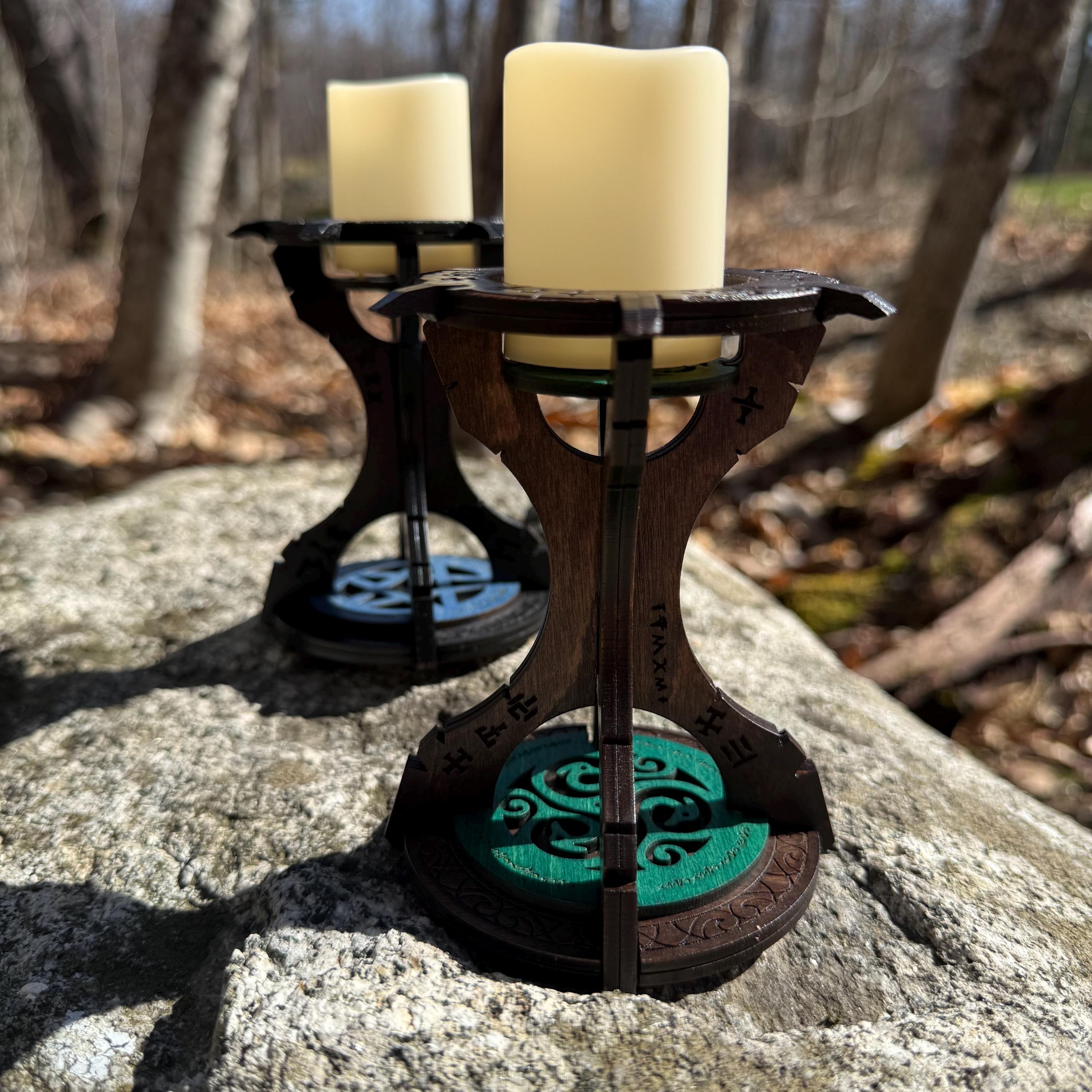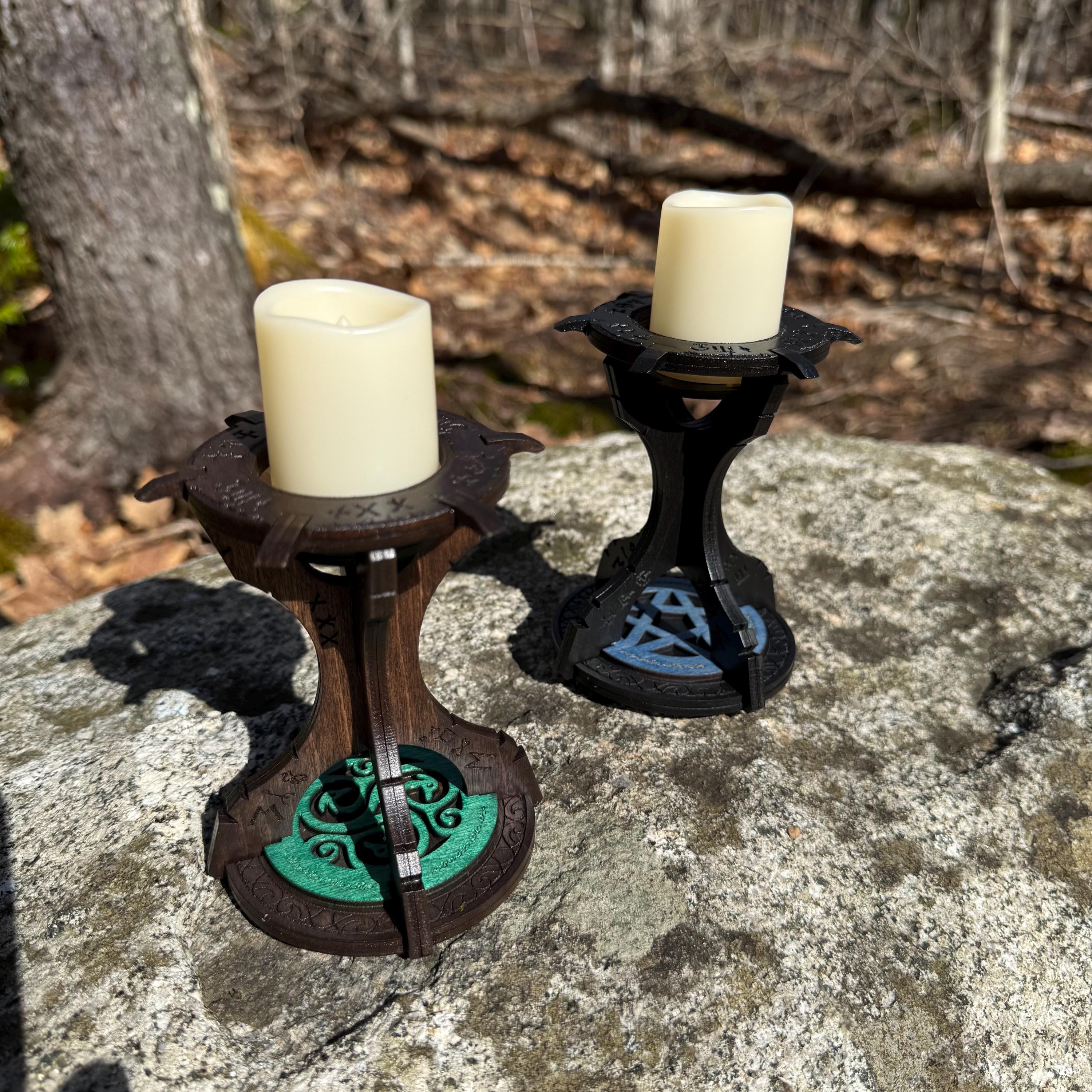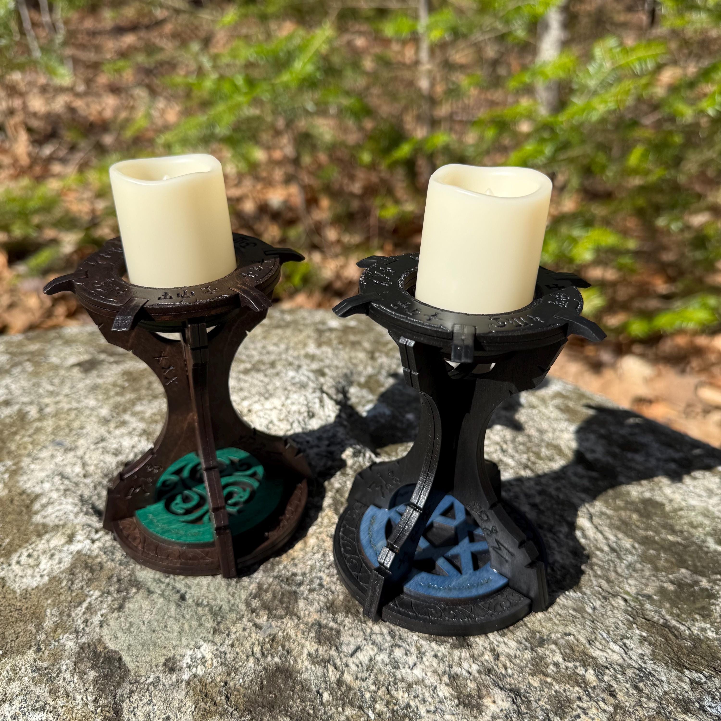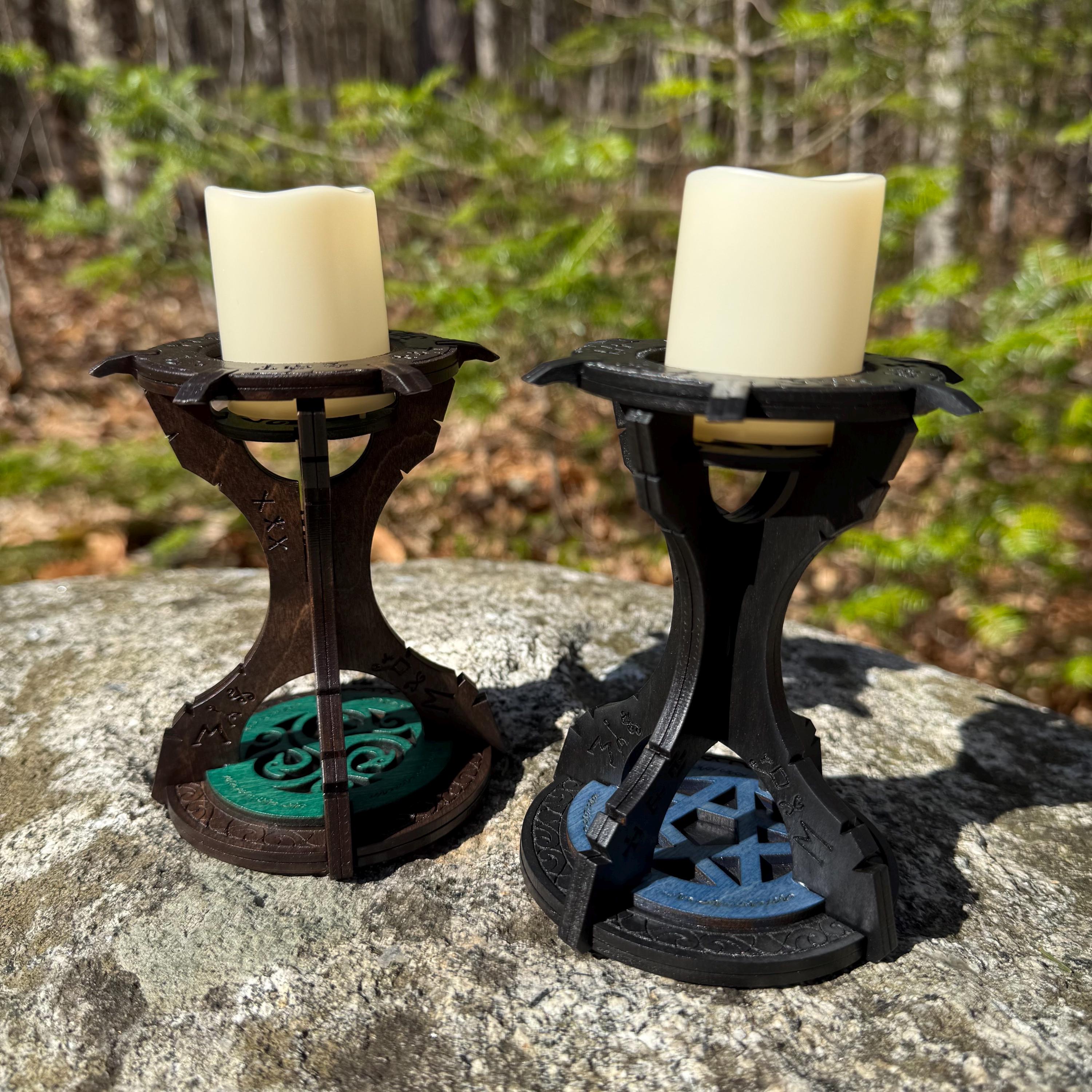 📷 In the sample photos, one candlestick is stained Black, with Azure pentacle accents; the other candlestick is stained Dark Oak, with Emerald triskel accents.