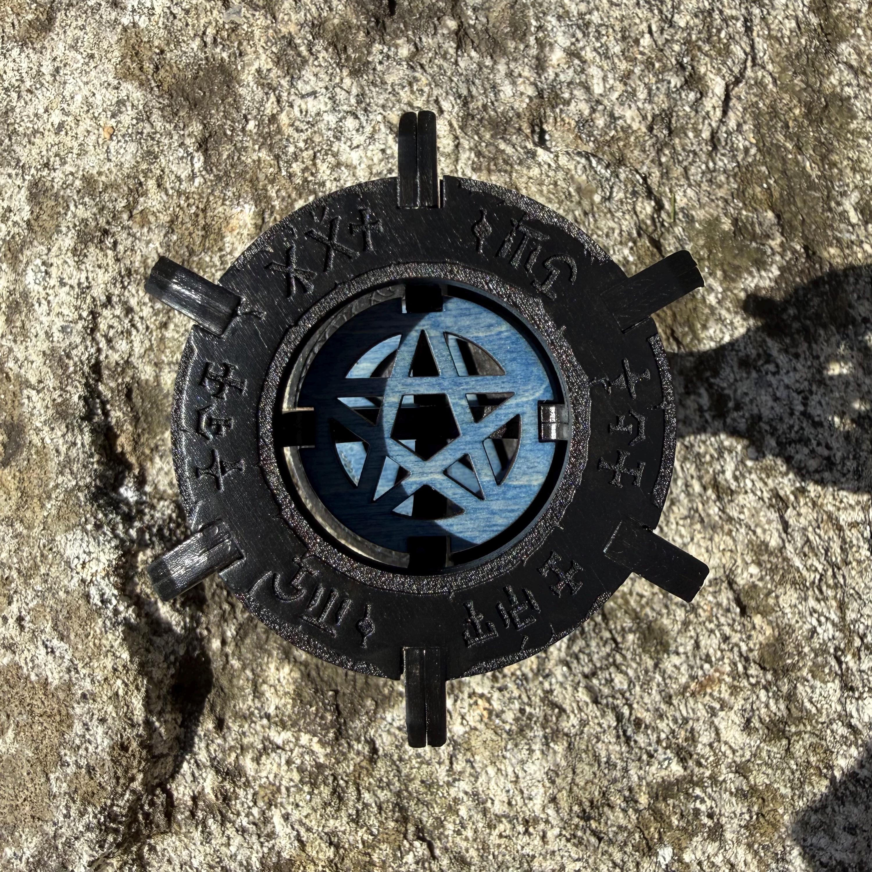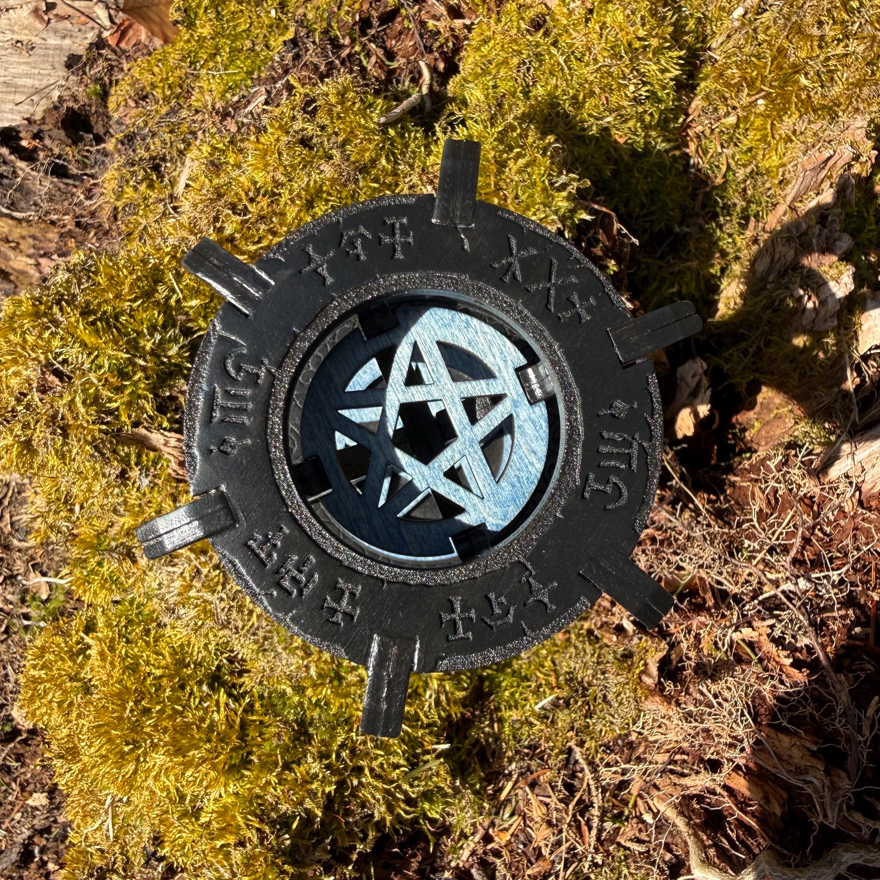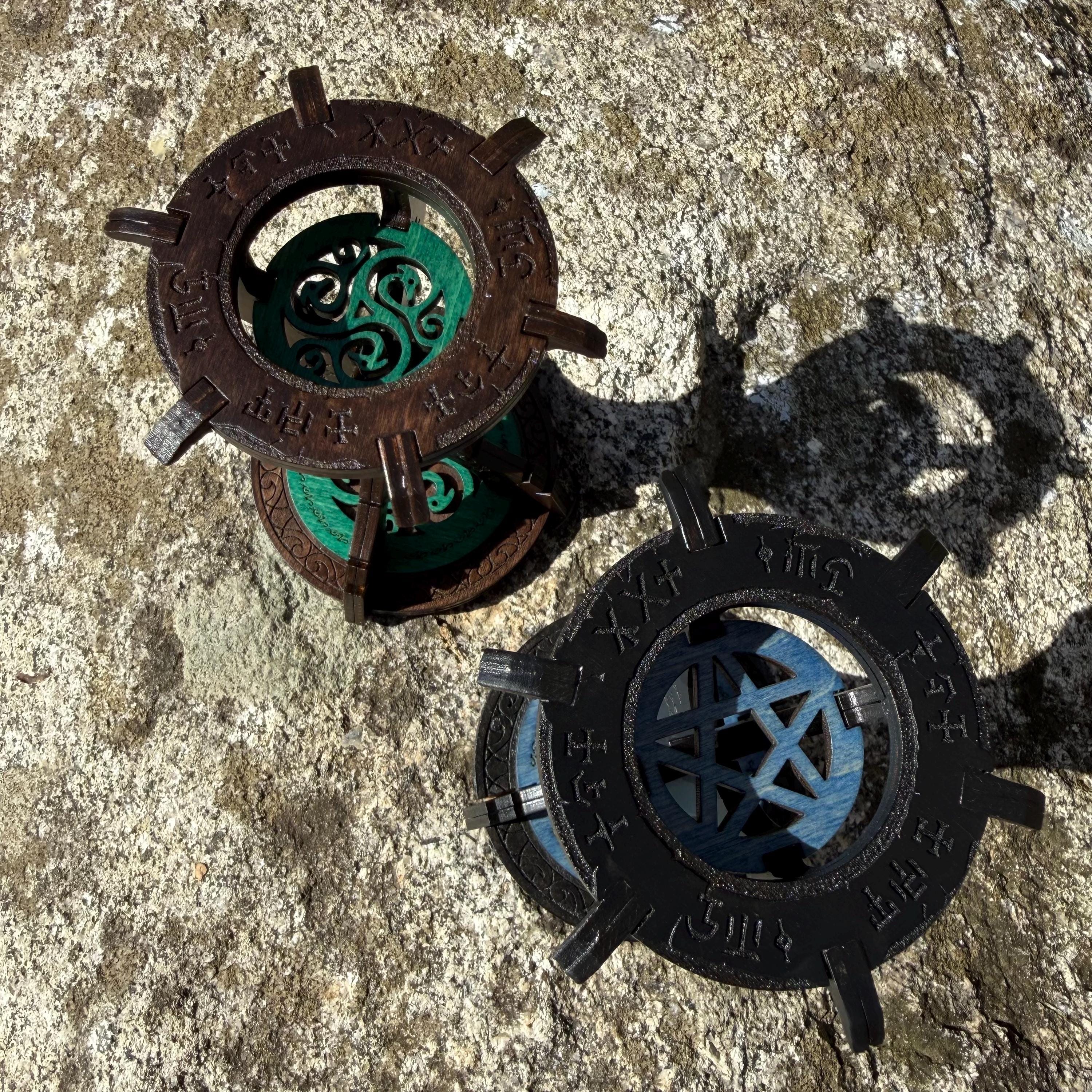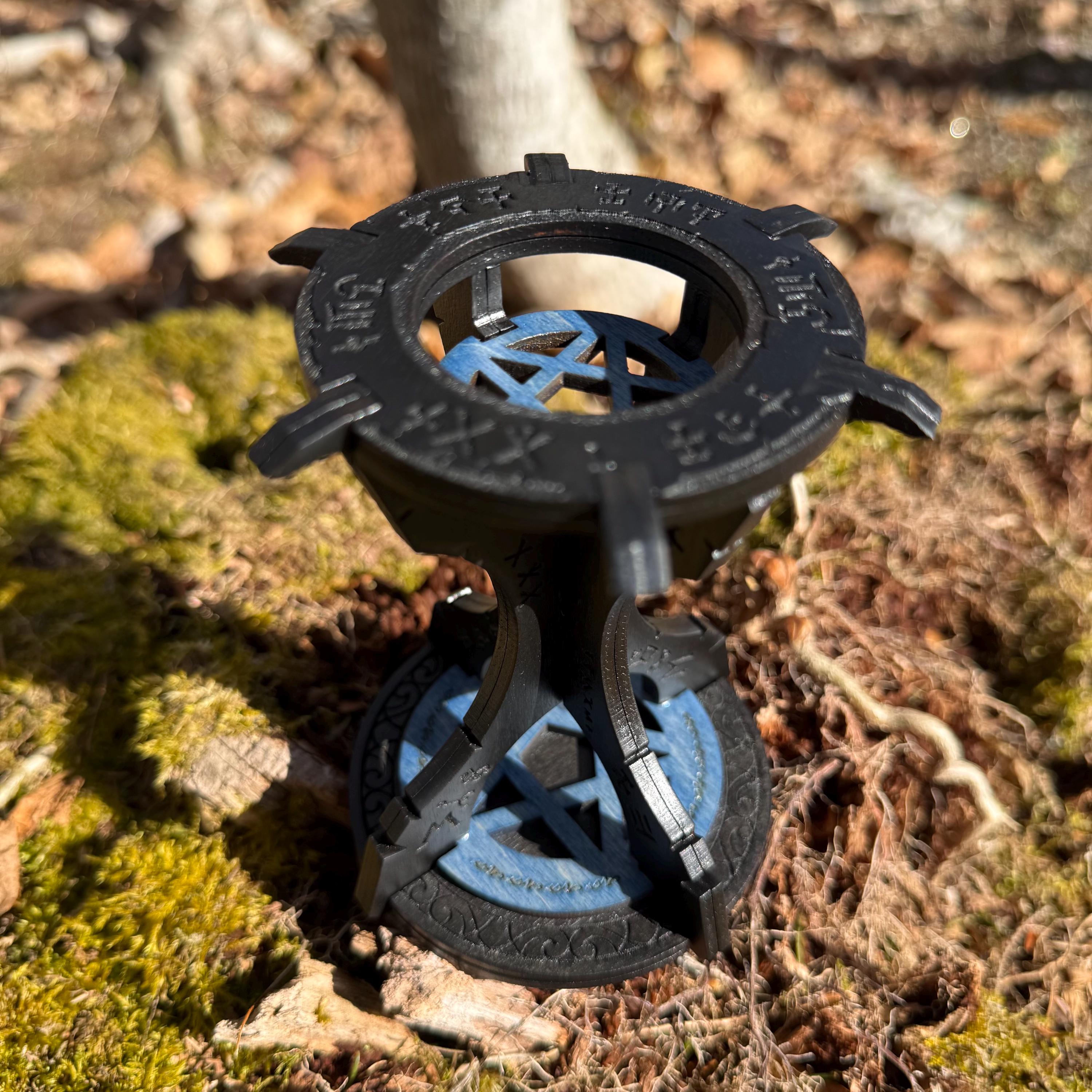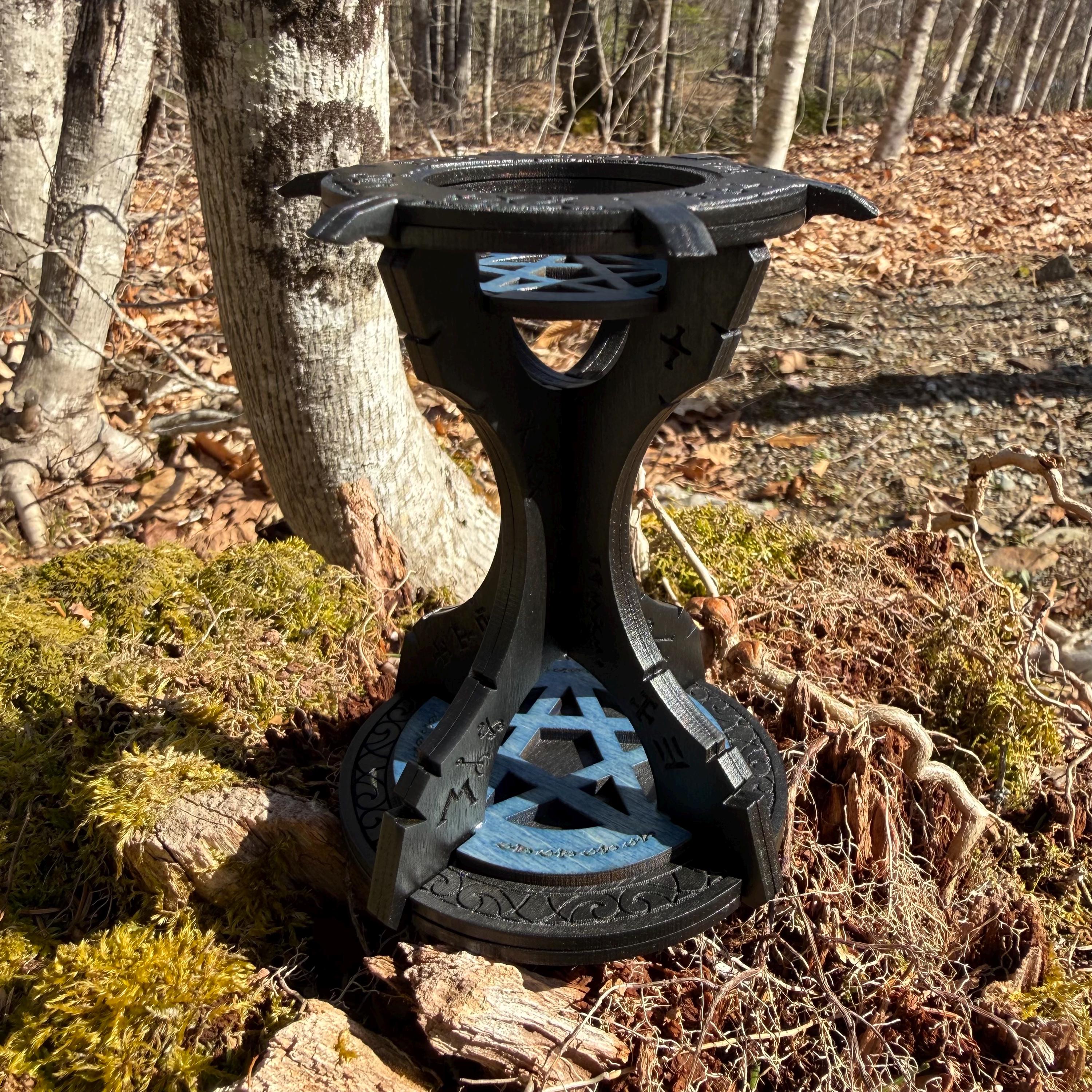📷 In the sample photos, one candlestick is stained Black, with Azure pentacle accents; the other candlestick is stained Dark Oak, with Emerald triskel accents.