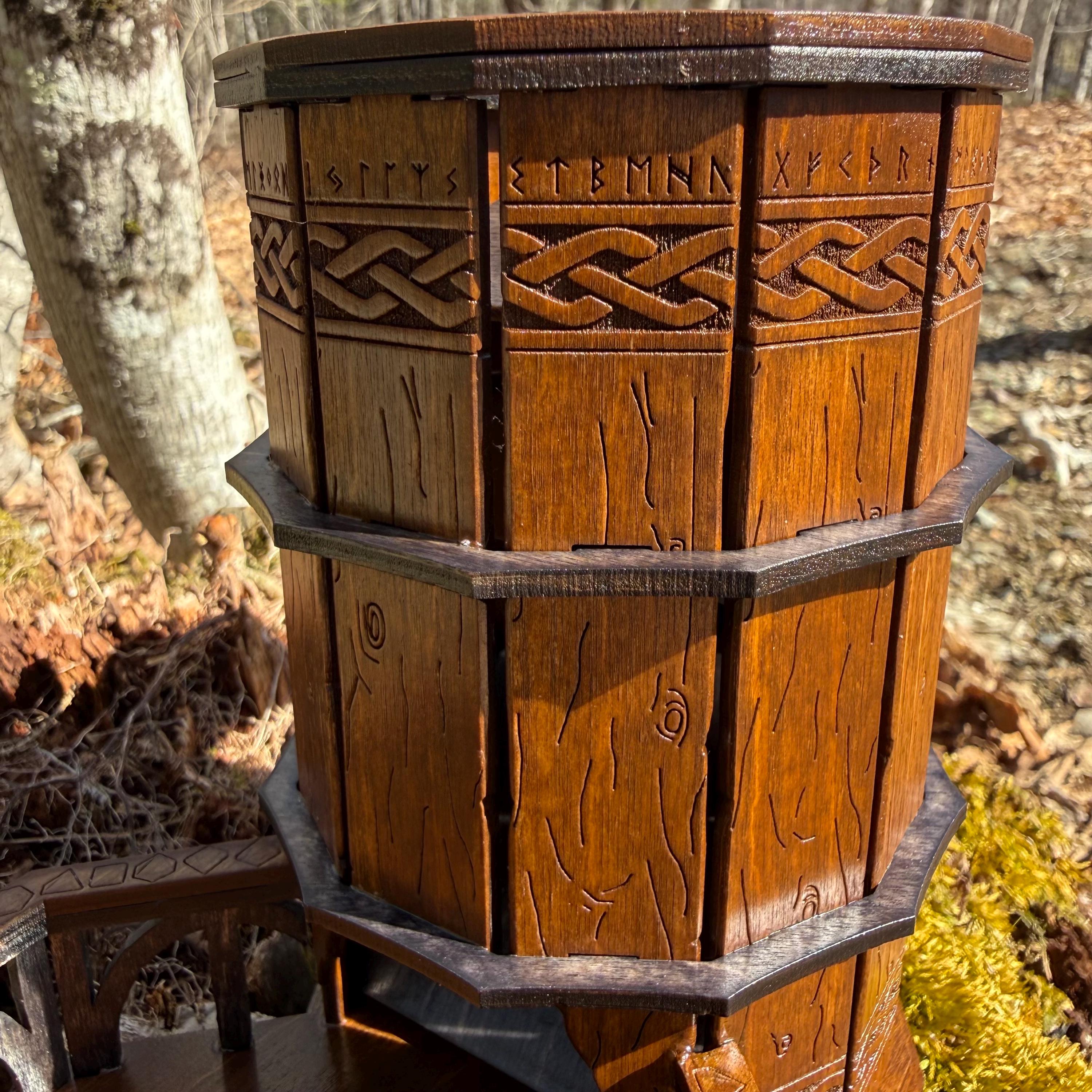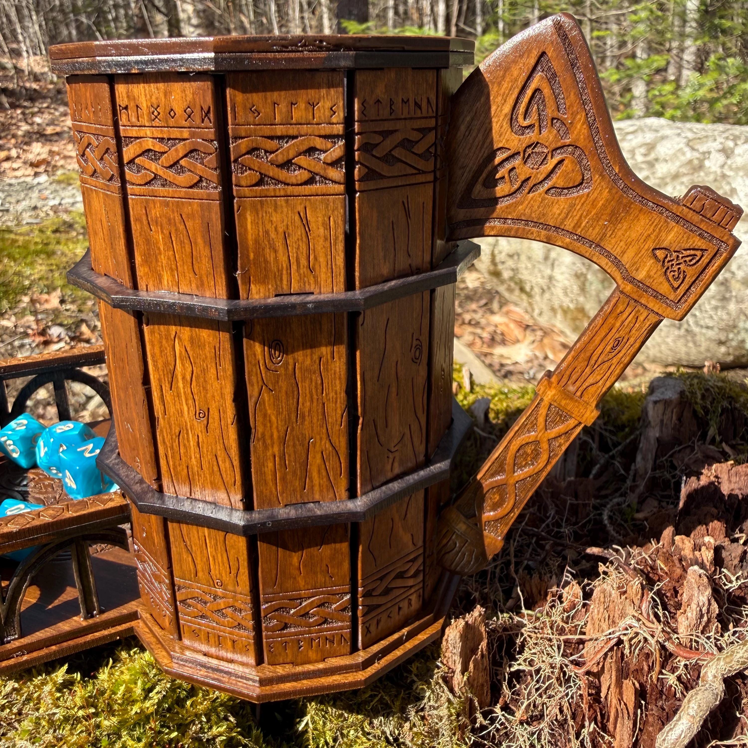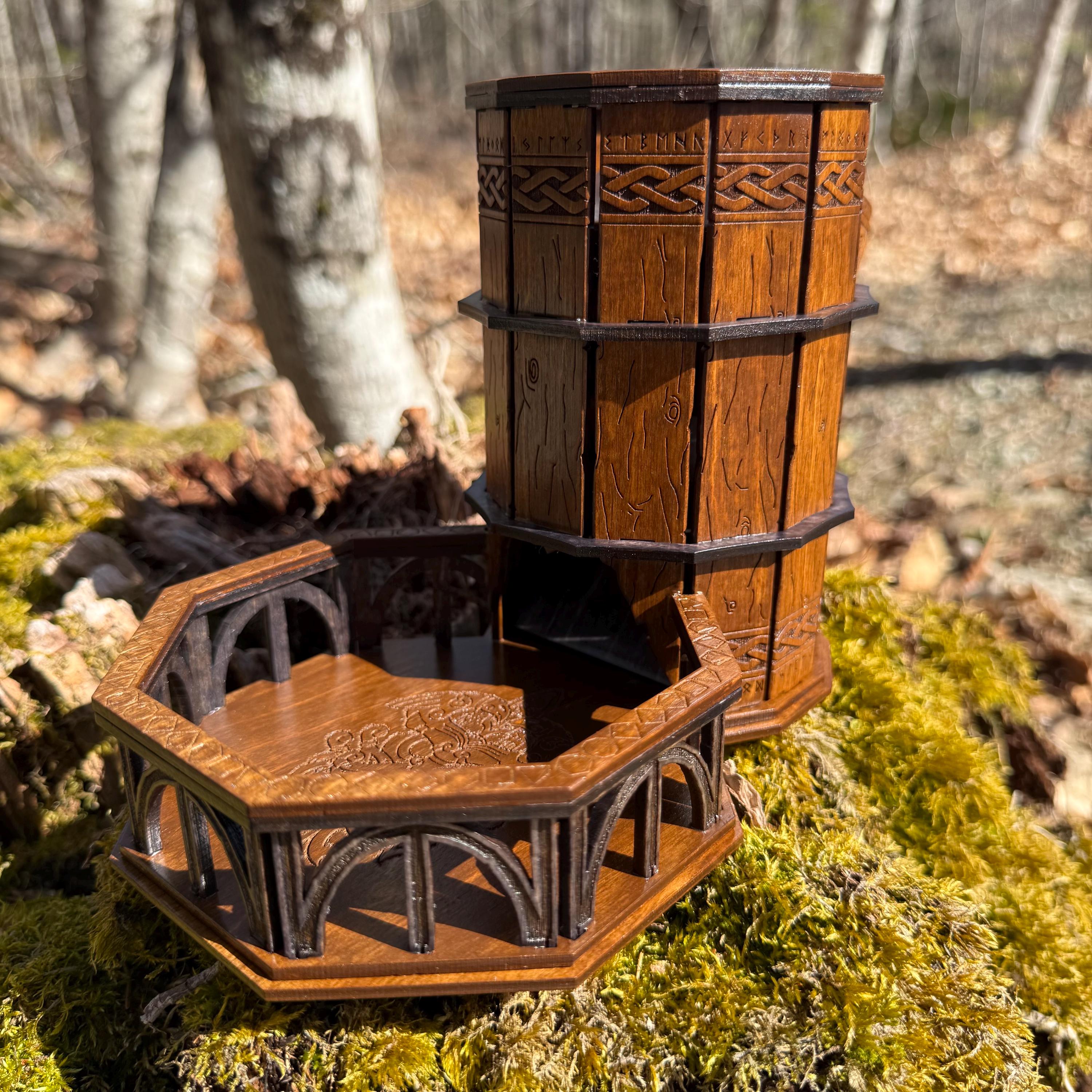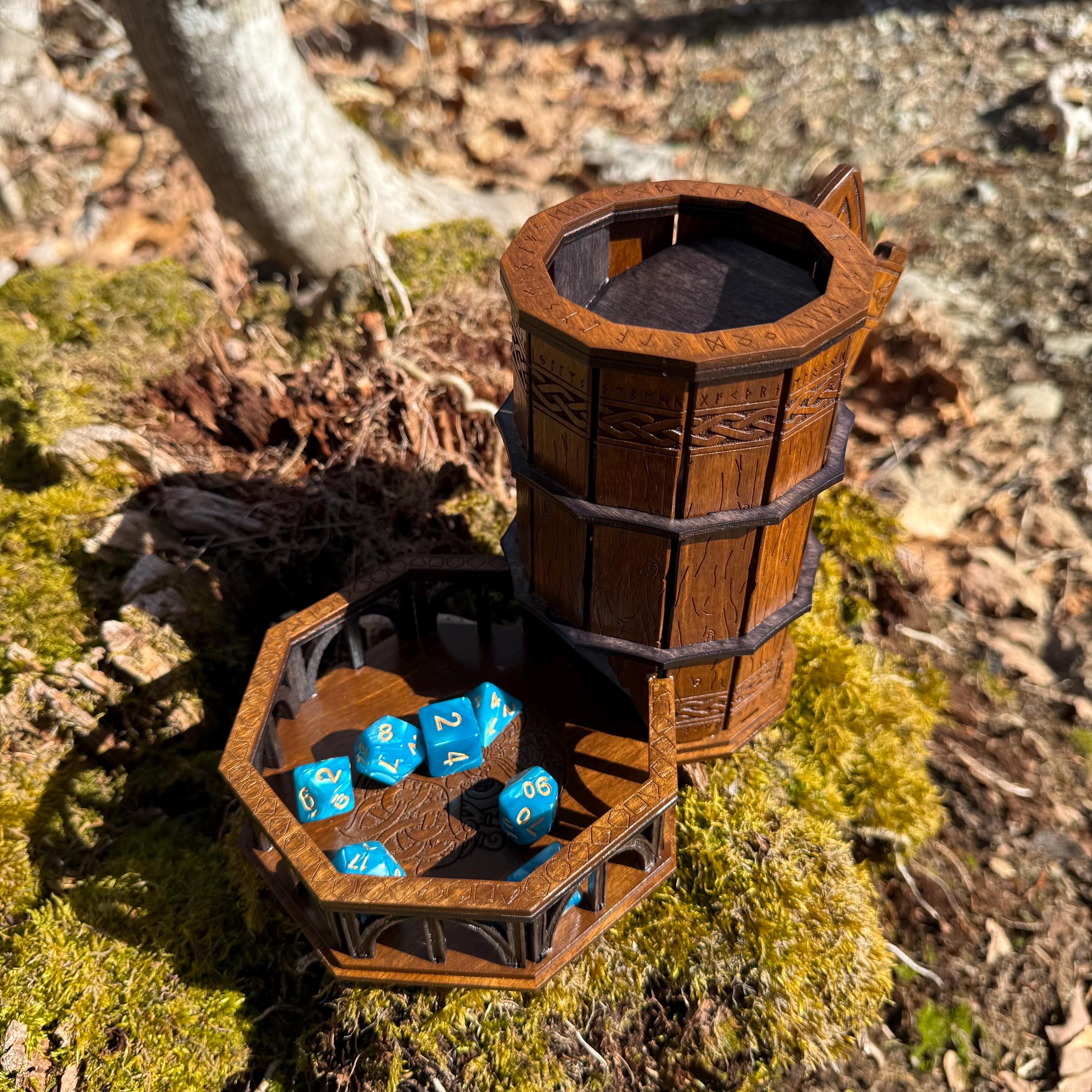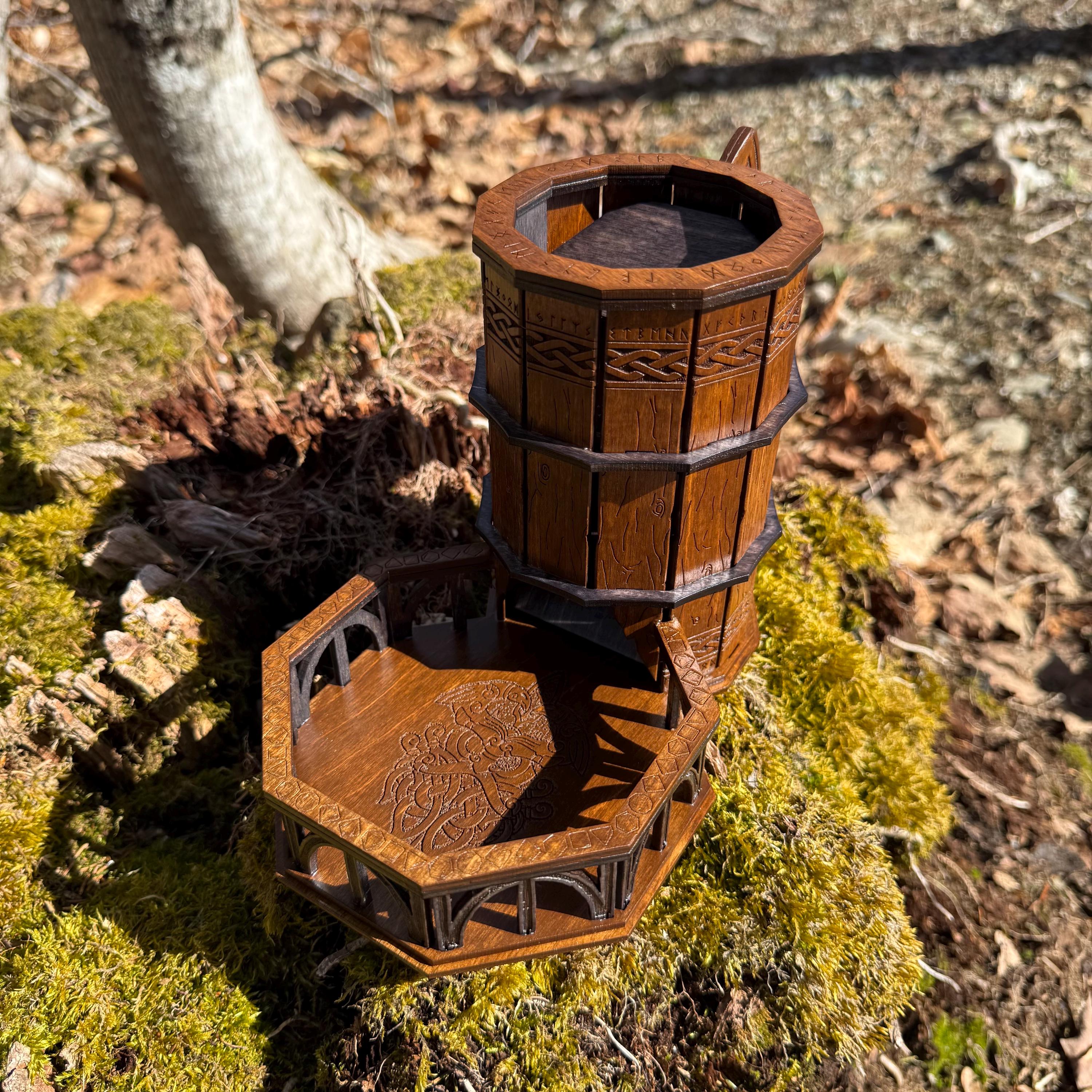 Immerse yourself in your next game night and weave epic tales of adventure with this handcrafted wooden dice tower! This laser-engraved, Nordic-themed dice tumbler is more than just a RPG accessory – it's a portal to illustrious gaming adventures and a handcrafted companion for your most memorable nights. Crafted from resilient birch plywood and engraved in high resolution detail, this dice tower is built to withstand countless gaming campaigns. A thematic and functional addition to any home game room, this tower is perfect for fantasy RPG players, board game enthusiasts, tabletop wargamers, or as a thoughtful gift for the imaginative adventurer in your life!