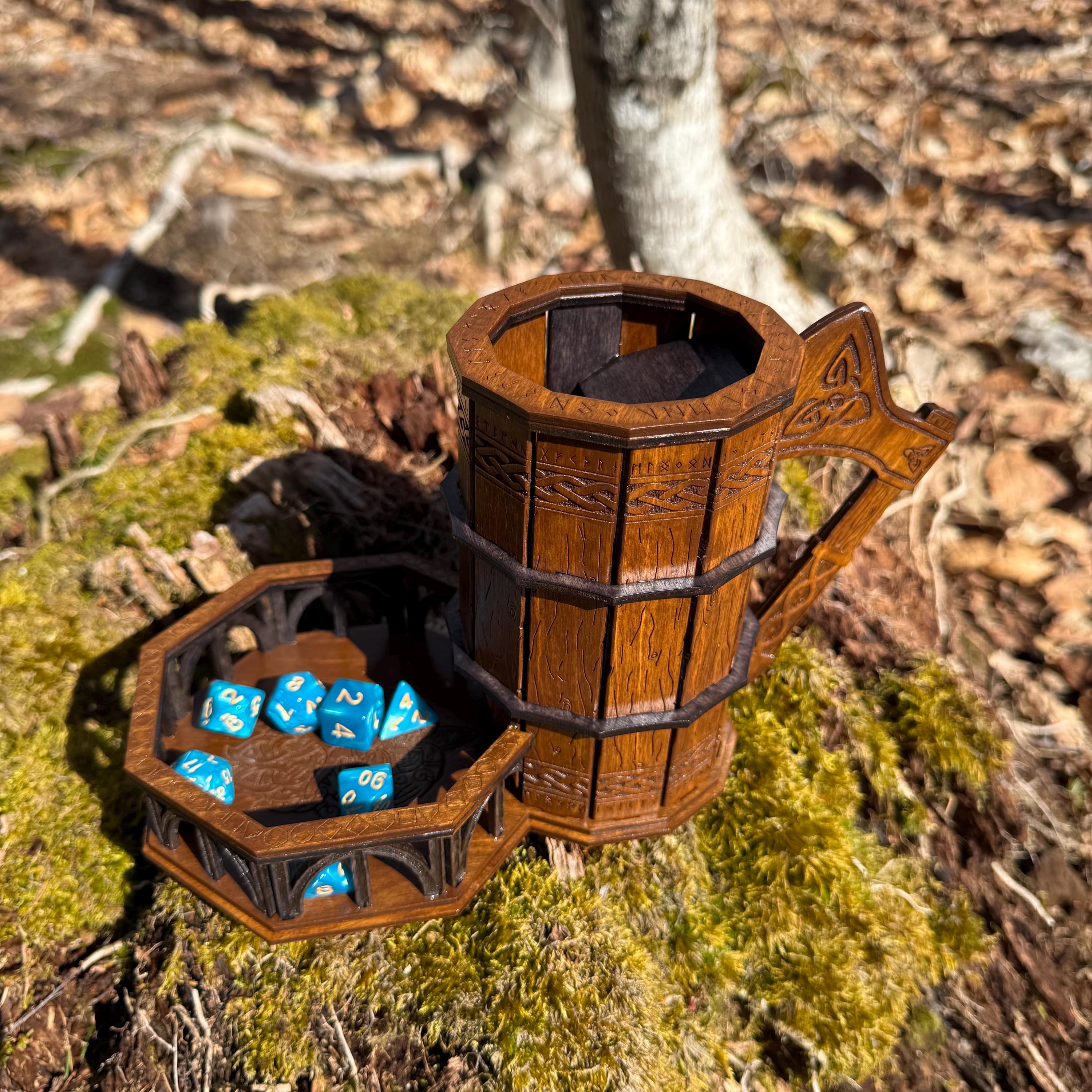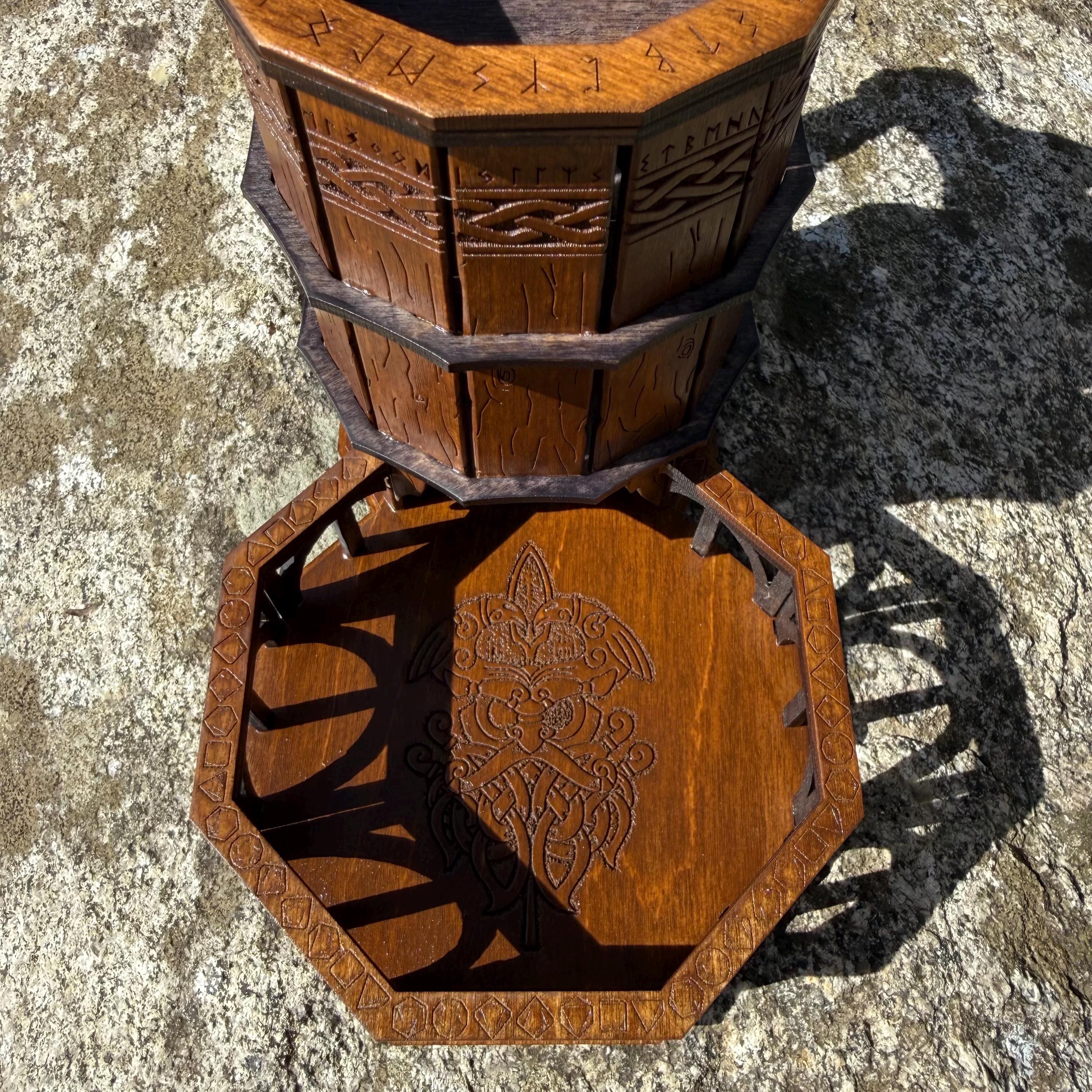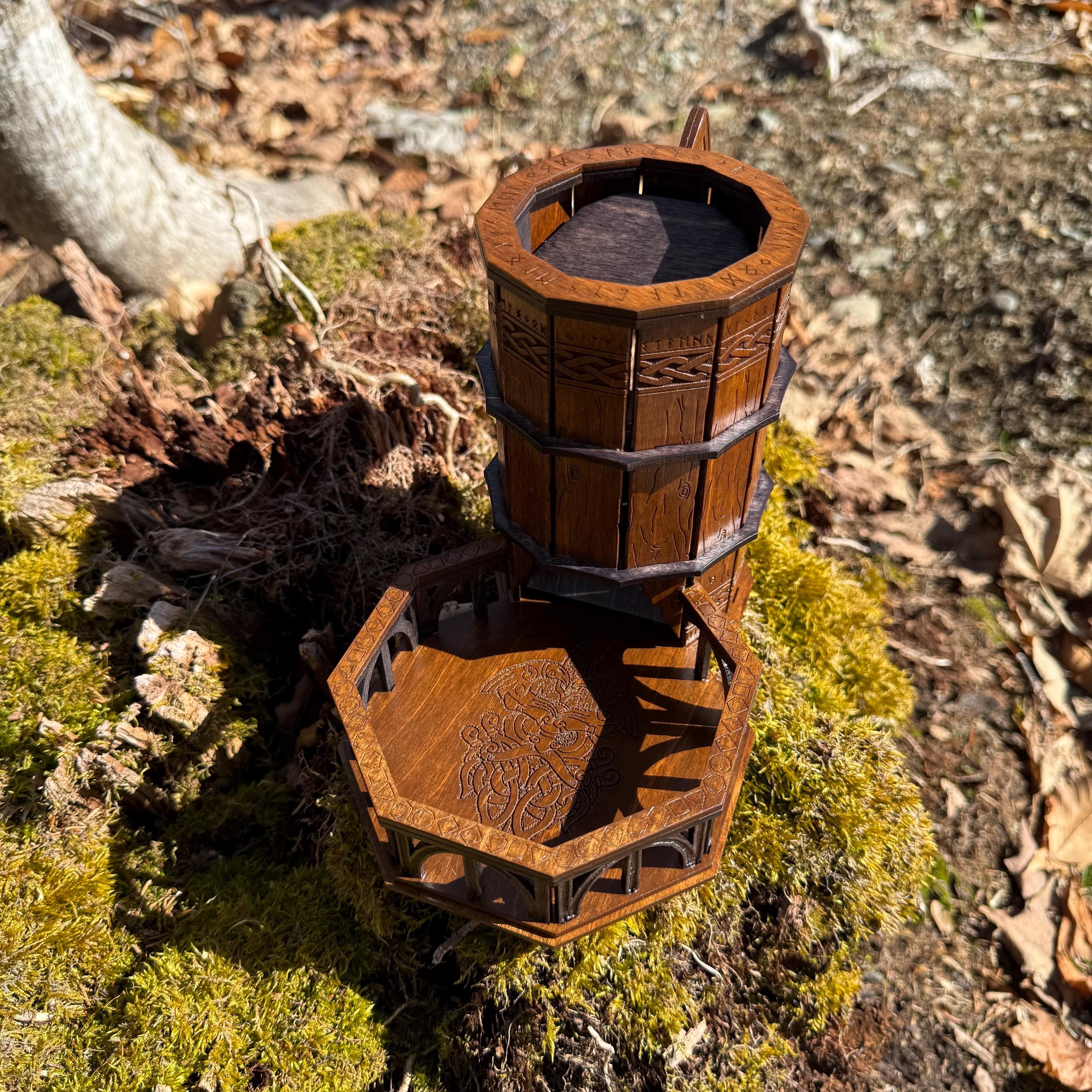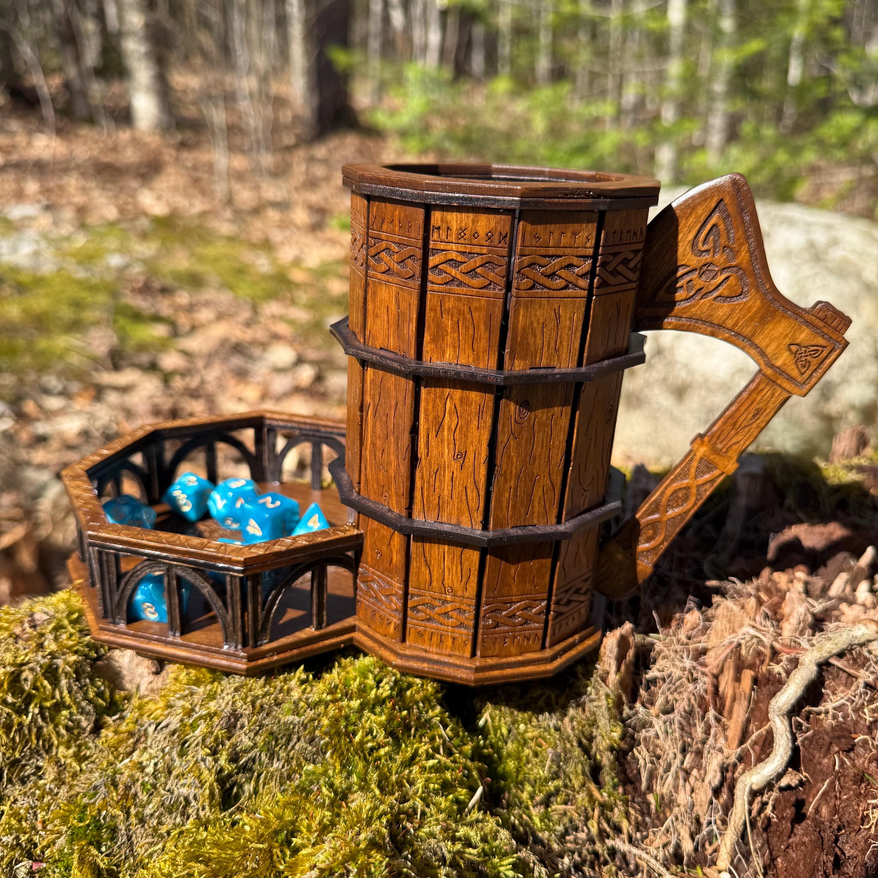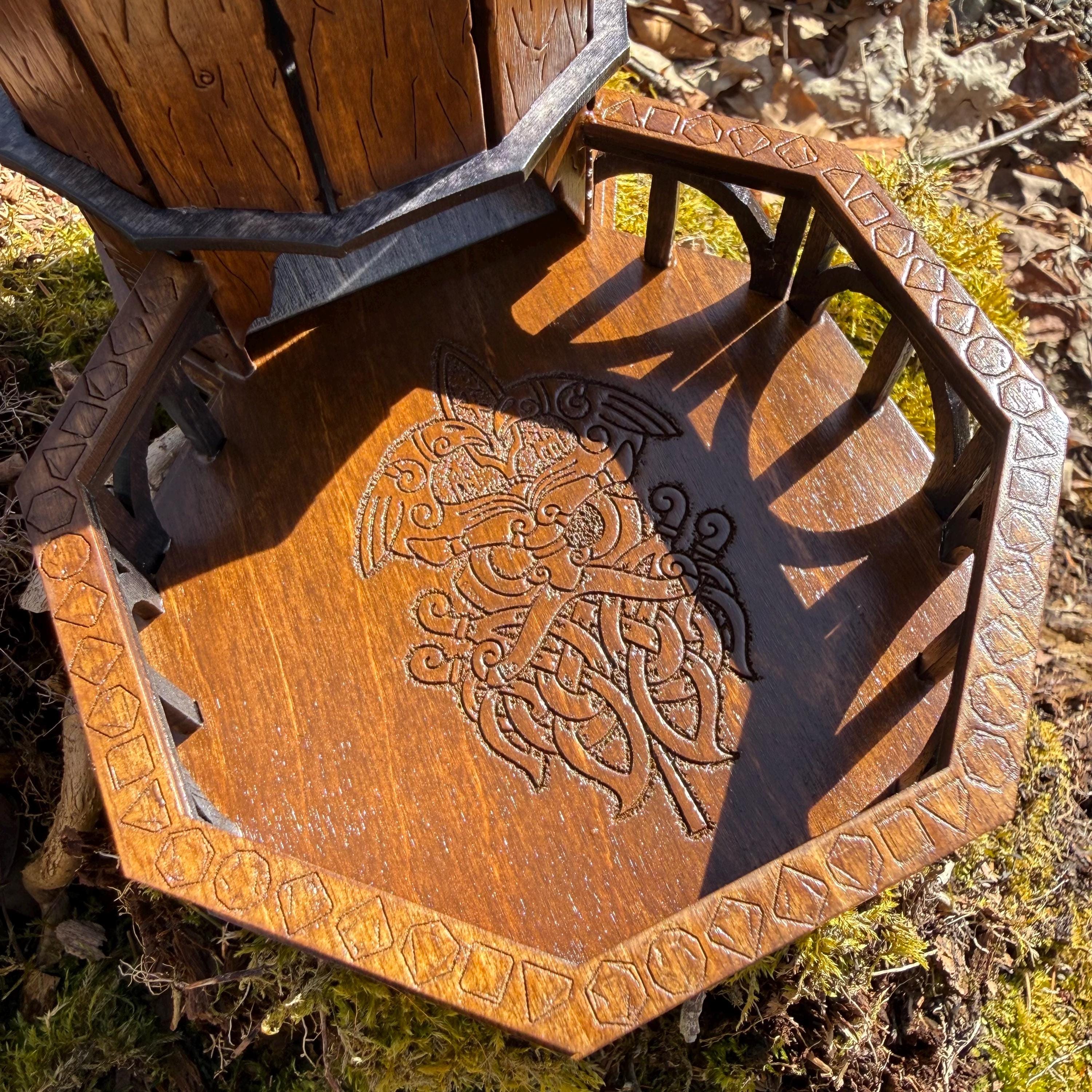 Immerse yourself in your next game night and weave epic tales of adventure with this handcrafted wooden dice tower! This laser-engraved, Nordic-themed dice tumbler is more than just a RPG accessory – it's a portal to illustrious gaming adventures and a handcrafted companion for your most memorable nights. Crafted from resilient birch plywood and engraved in high resolution detail, this dice tower is built to withstand countless gaming campaigns. A thematic and functional addition to any home game room, this tower is perfect for fantasy RPG players, board game enthusiasts, tabletop wargamers, or as a thoughtful gift for the imaginative adventurer in your life!