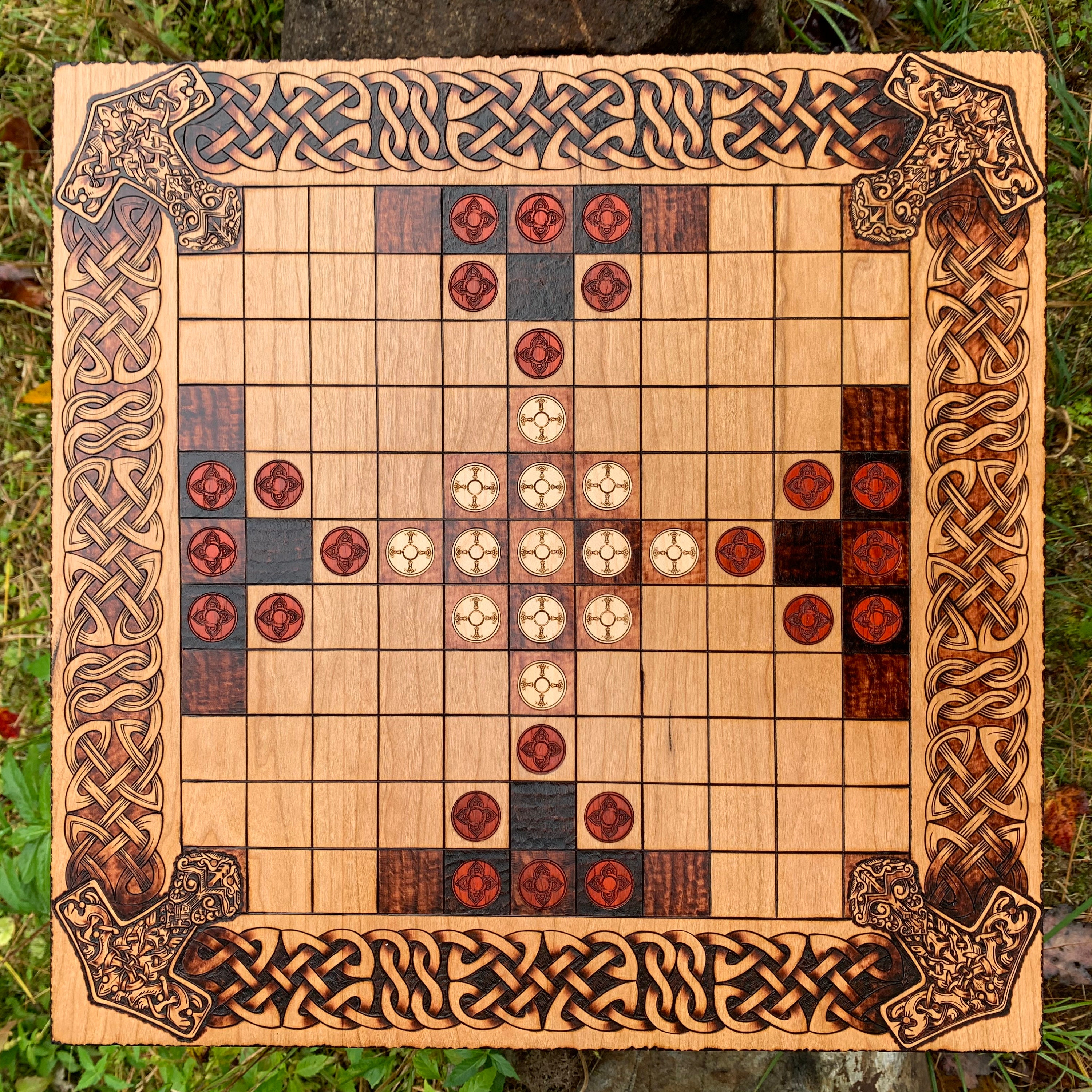Detailed wood inlays for hnefatafl and other select games produced by IGNITED Arts & Design; each set created to complement aspects of the overall board design. Produced from 1/8-inch thick domestic and/or exotic hardwood, and glued into precisely drilled divots in the game board's surface. Set your game apart with these beautiful inlays, for an added level of decorative and thematic detail.